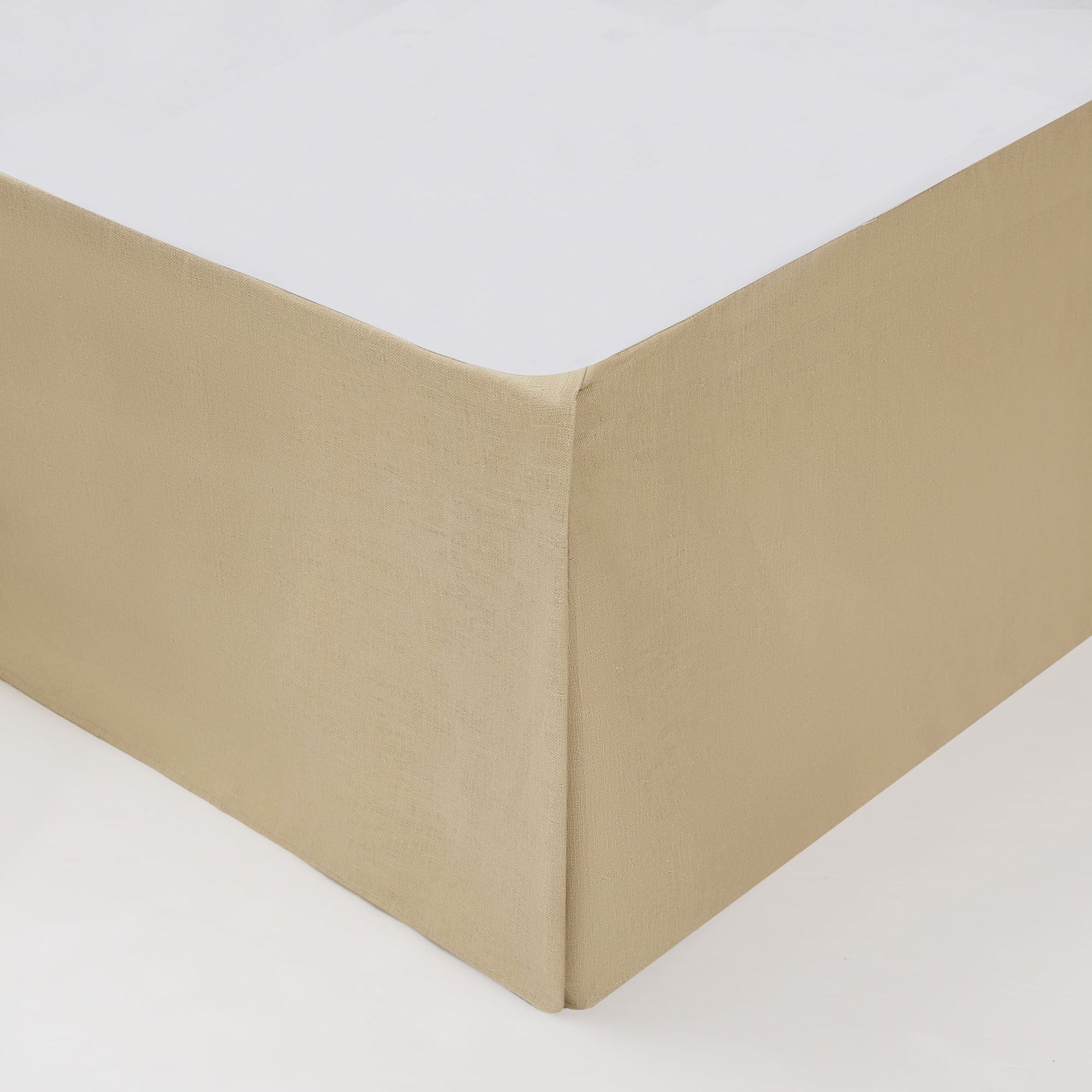 The 17" drop Bedskirt is tan linen with kick pleats and split corners. Choose Queen or King.