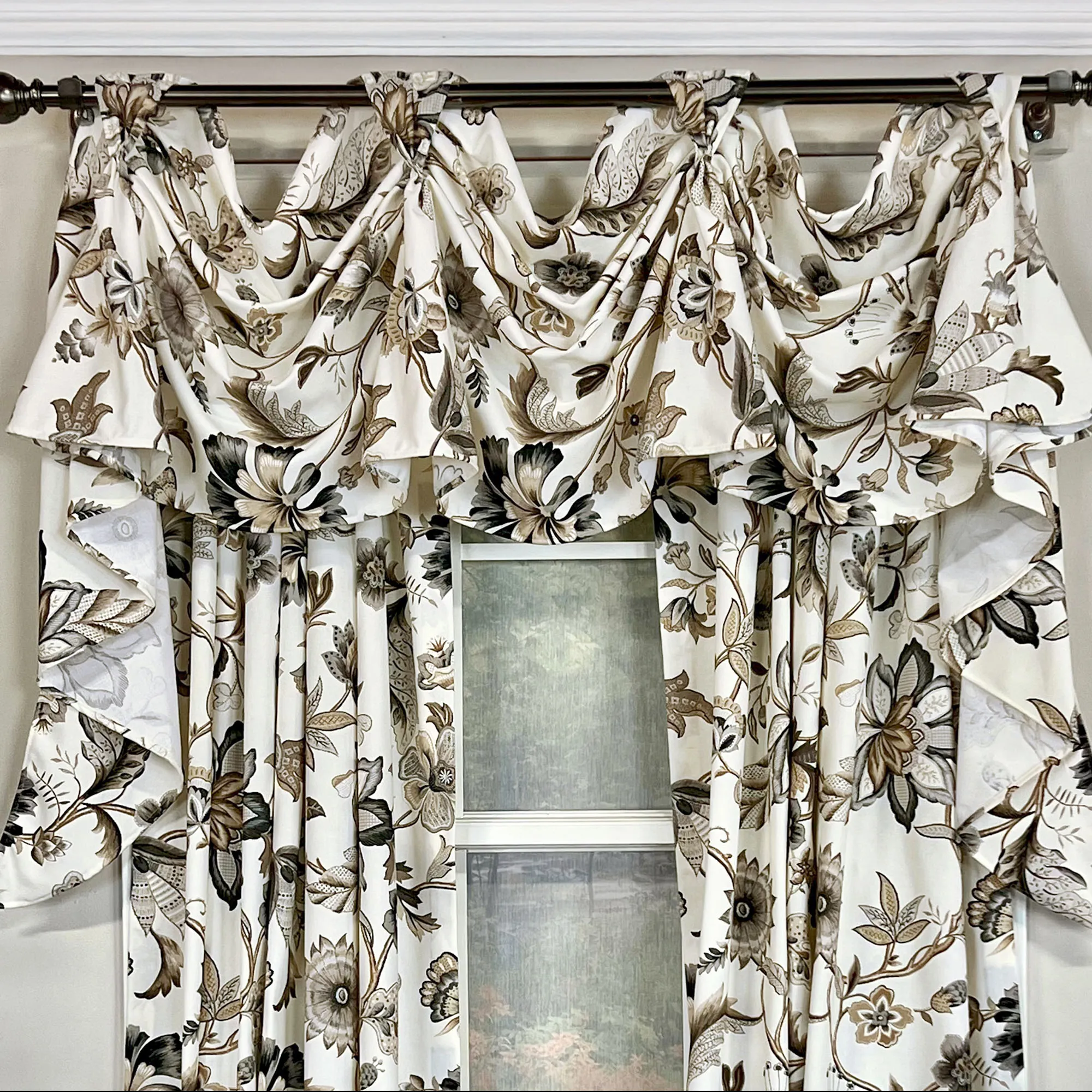 The Armistine Victory Valance adds a luxurious panache to your window. Printed in neutral tones of gray, black, charcoal, and brown, Jacobean florals blossom and vine across the eggshell cotton window valance. Perfect for windows up to 54"W, the victory valance hangs via your decorative curtain rod, up to 1.5" dia. Each scoop is 21"L; the jabot sides are 34"L each; and the front tabs hang 15"-18" apart with 5"-6" dips. Overall, the valance measures 60"Wx32"L. Spot clean only. Sorry, the curtain panels shown are not available.
