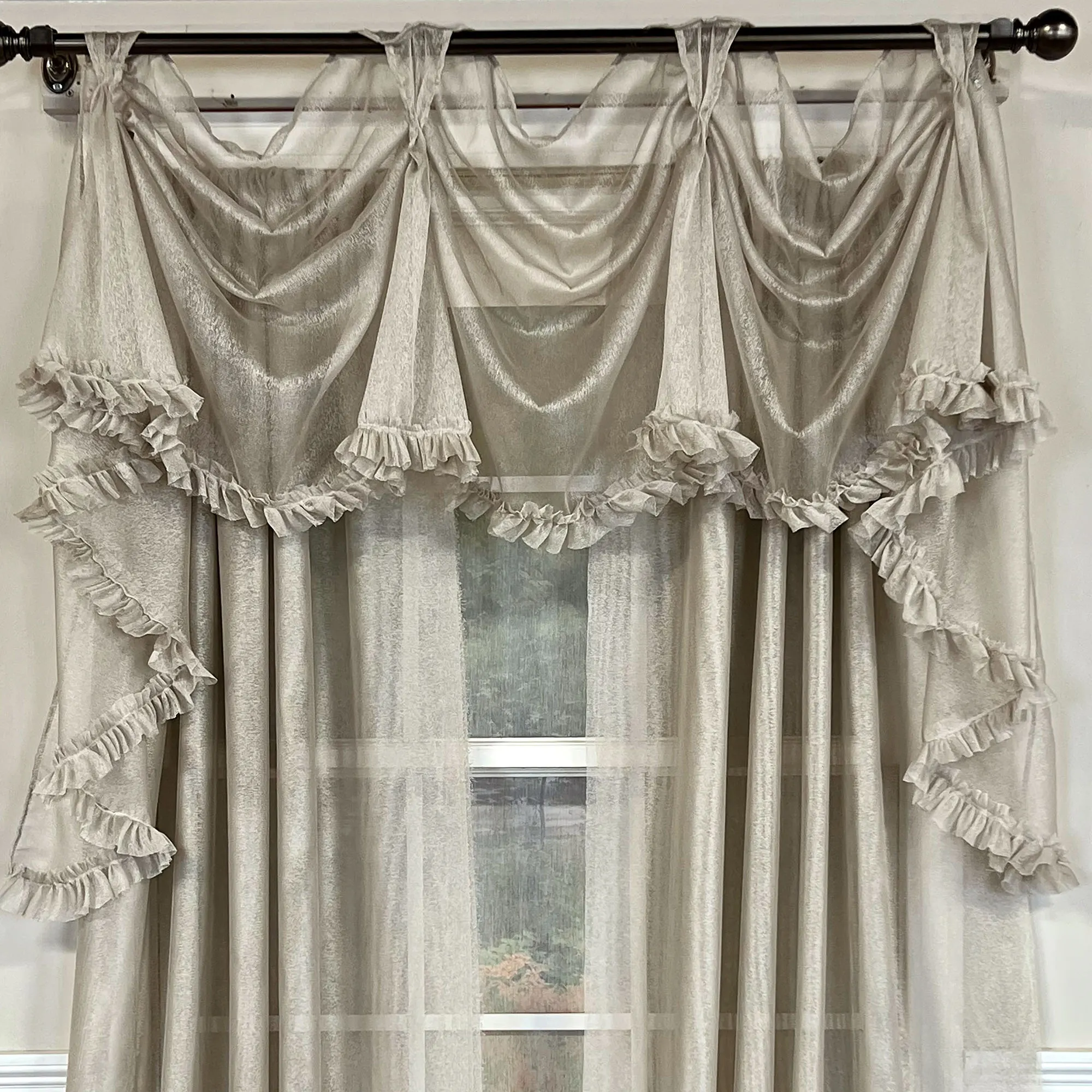 • Valance has scoops, bells, jabots, front tabs, and a 2" ruffle