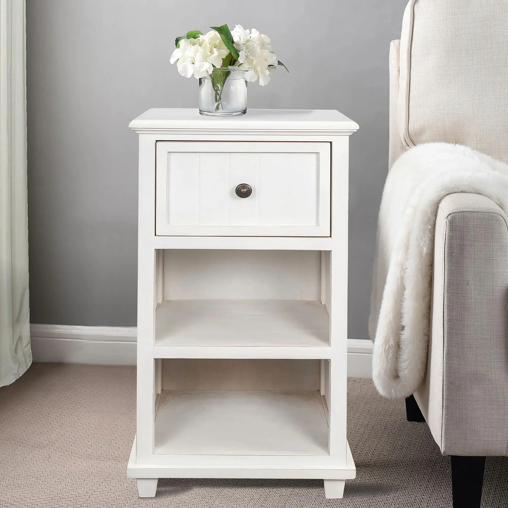 Enhance any living space with the stylish Aryana One-Drawer Side Table. The acacia wood cabinet has beadboard accents, one drawer with a metal pull, and two open shelves. Measures 16"Wx13"Dx30"H; weighs 19 lbs.