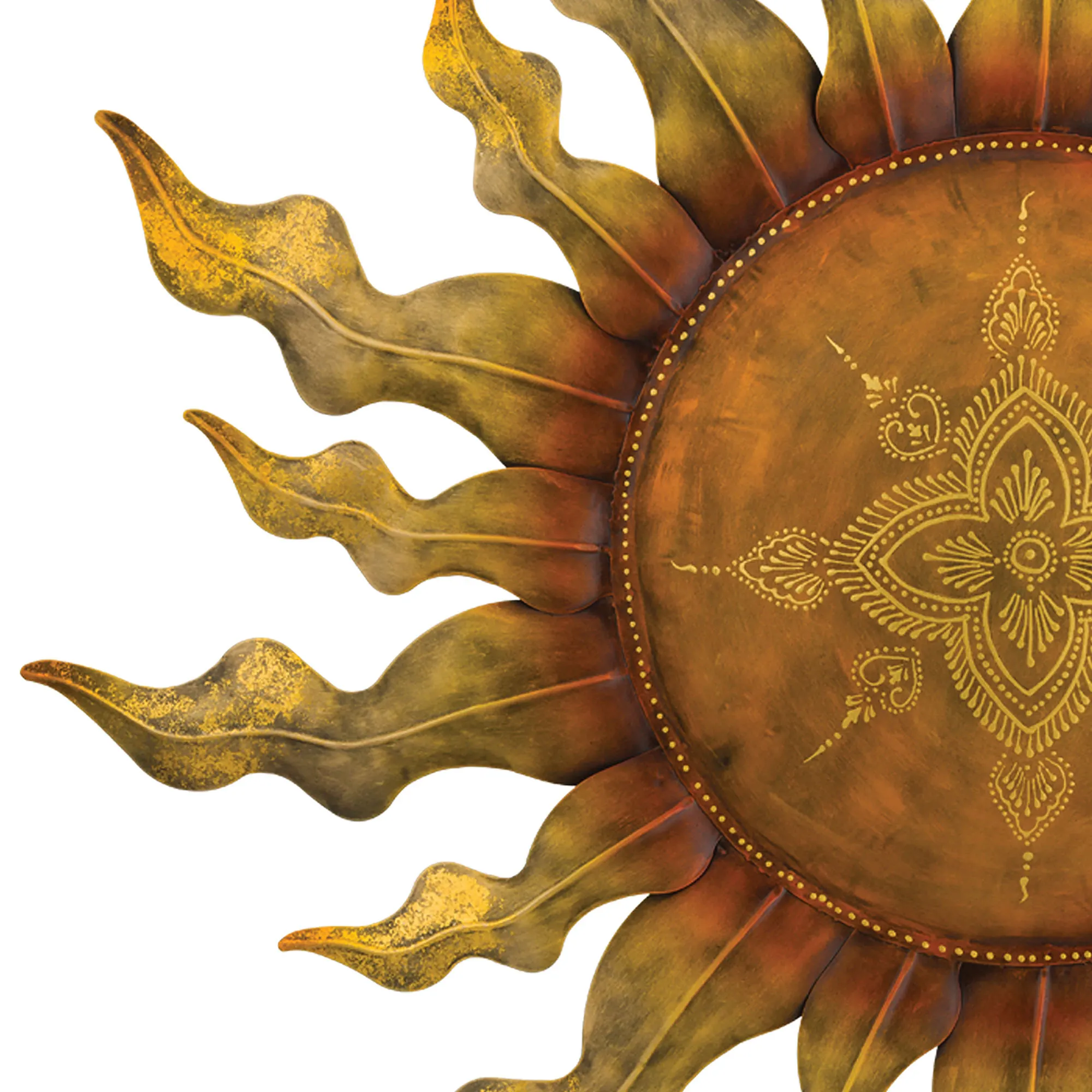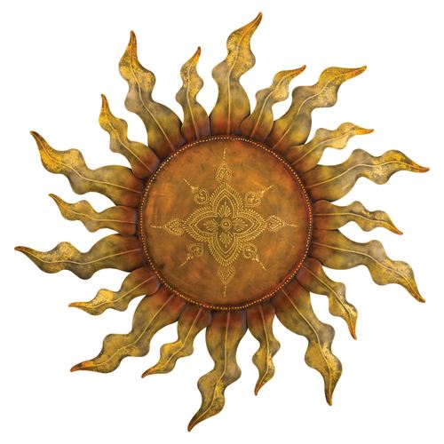 The Aryana Sun Wall Sculpture radiates undeniable brilliance in your indoor or outdoor space year round. In a dimensional design, the metal wall art features weather- and fade-resistant metallic golden copper tones that lend an innate warmth to the design. Gold foil highlights shimmer from the ends of the wavy rays, while detailed henna-inspired medallion motifs flourish in the center. Overall, the sun wall art sculpture measures 35"dia.x2.5"D.