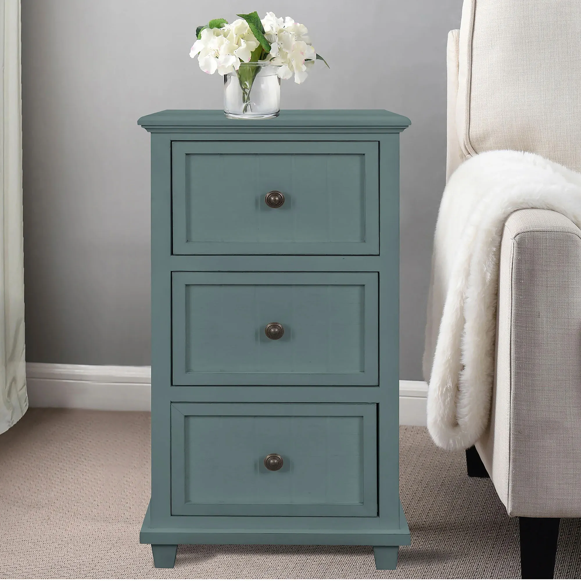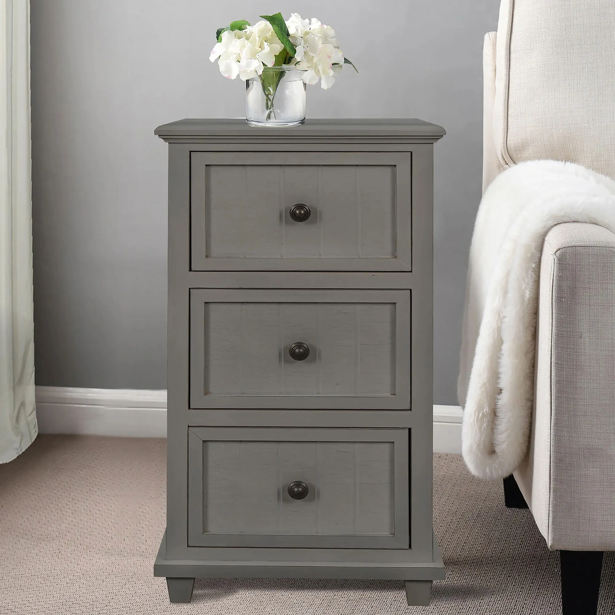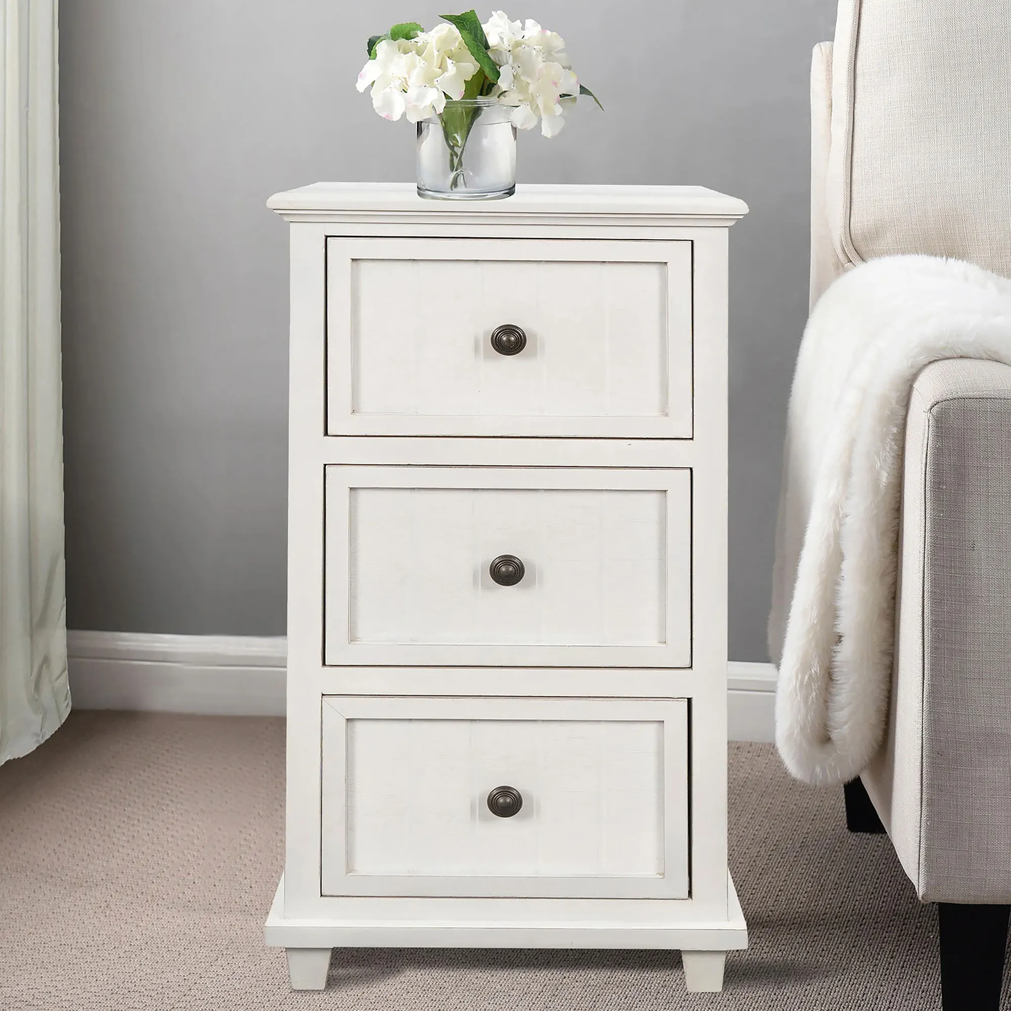 Enhance any living space with the Aryana Three-Drawer Side Table. The acacia wood cabinet has three drawers with metal pulls and beadboard accents. Measures 16"Wx13"Dx30"H; weighs approx. 27 lbs.