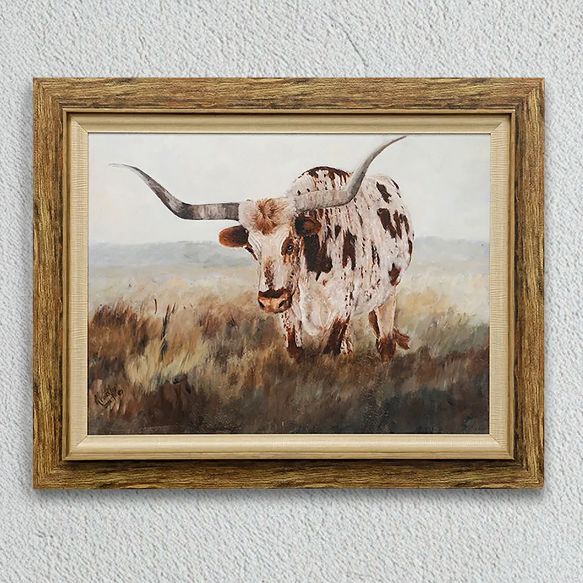 The As Time Goes By Longhorn Cow Framed Wall Art is a print on paper with a polystyrene frame. Made in the USA.