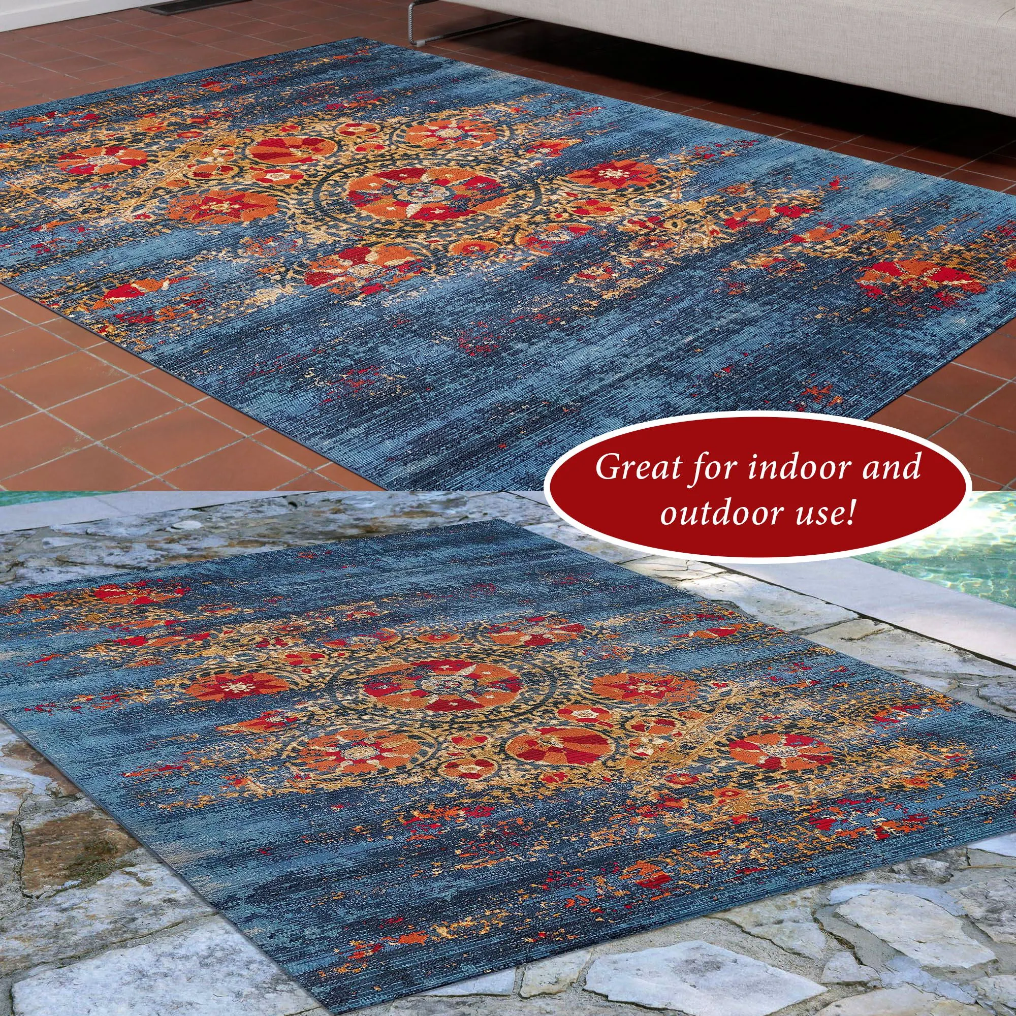 Fresh pigments create bold strokes within the Asara Rug, perfect for making a statement in your indoor or outdoor space. Machine-woven from polypropylene/polyester, the .125" thick rug features an abstract distressed design of red, orange, and gold ornate floral medallions against a rich navy and bright blue variegated ground. Outdoor seasonal use; do not expose this rug to freezing temperatures. Spot clean and rinse with a garden hose; for stubborn stains, we recommend professional cleaning by a rug cleaner. Imported.