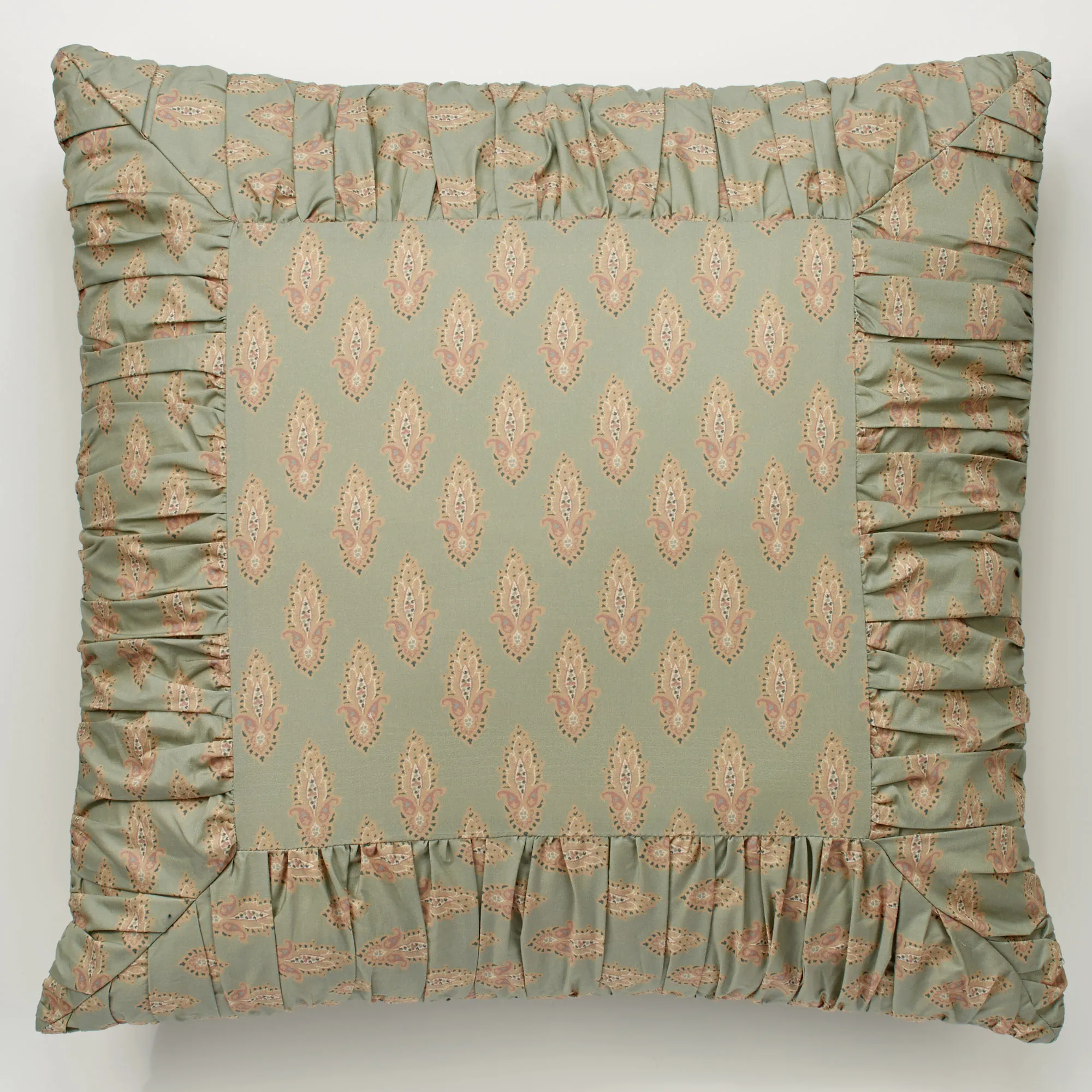 The Ashland European Sham will give your bed a cozy and comfortable look. The cotton European sham has a foulard design in shades of tan, green, blue, blush, and ecru on a sage background. European sham has a ruched outer border and a French back closure. Machine wash. Imported.