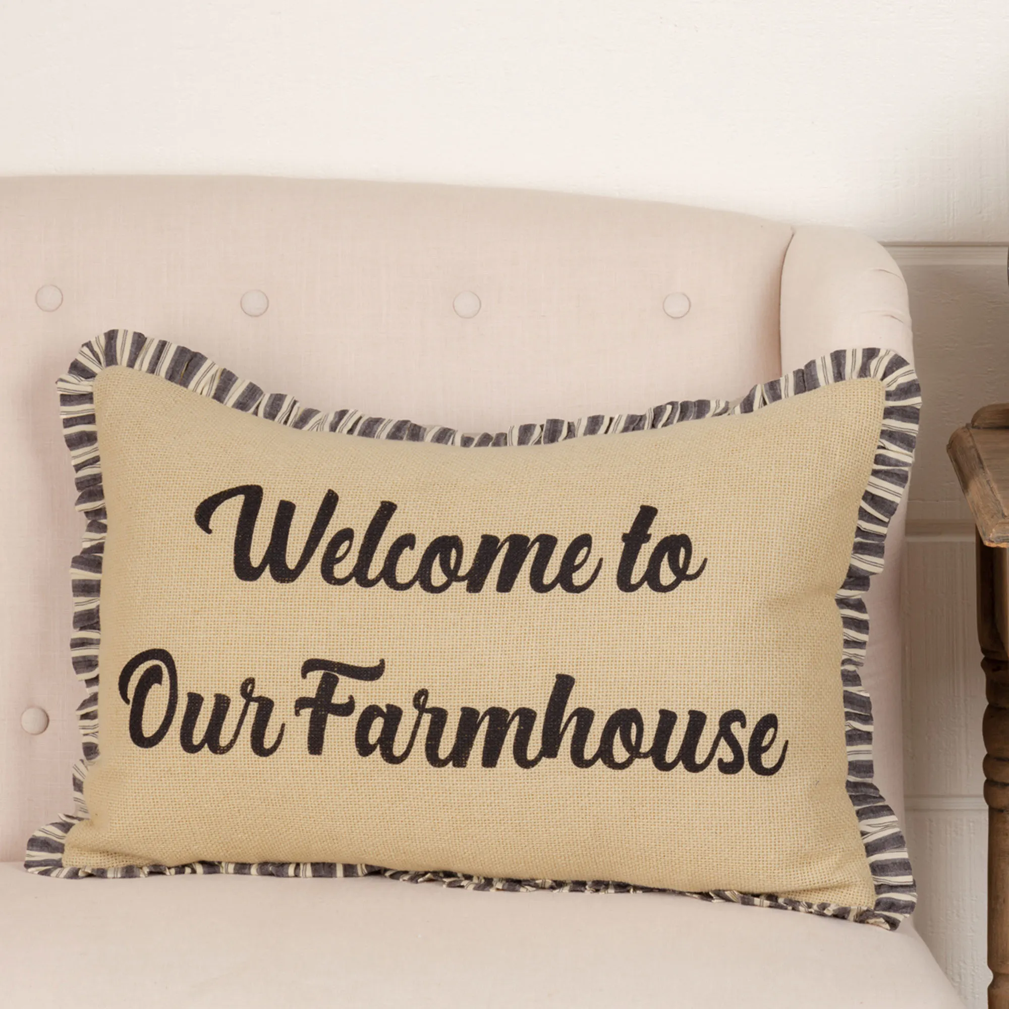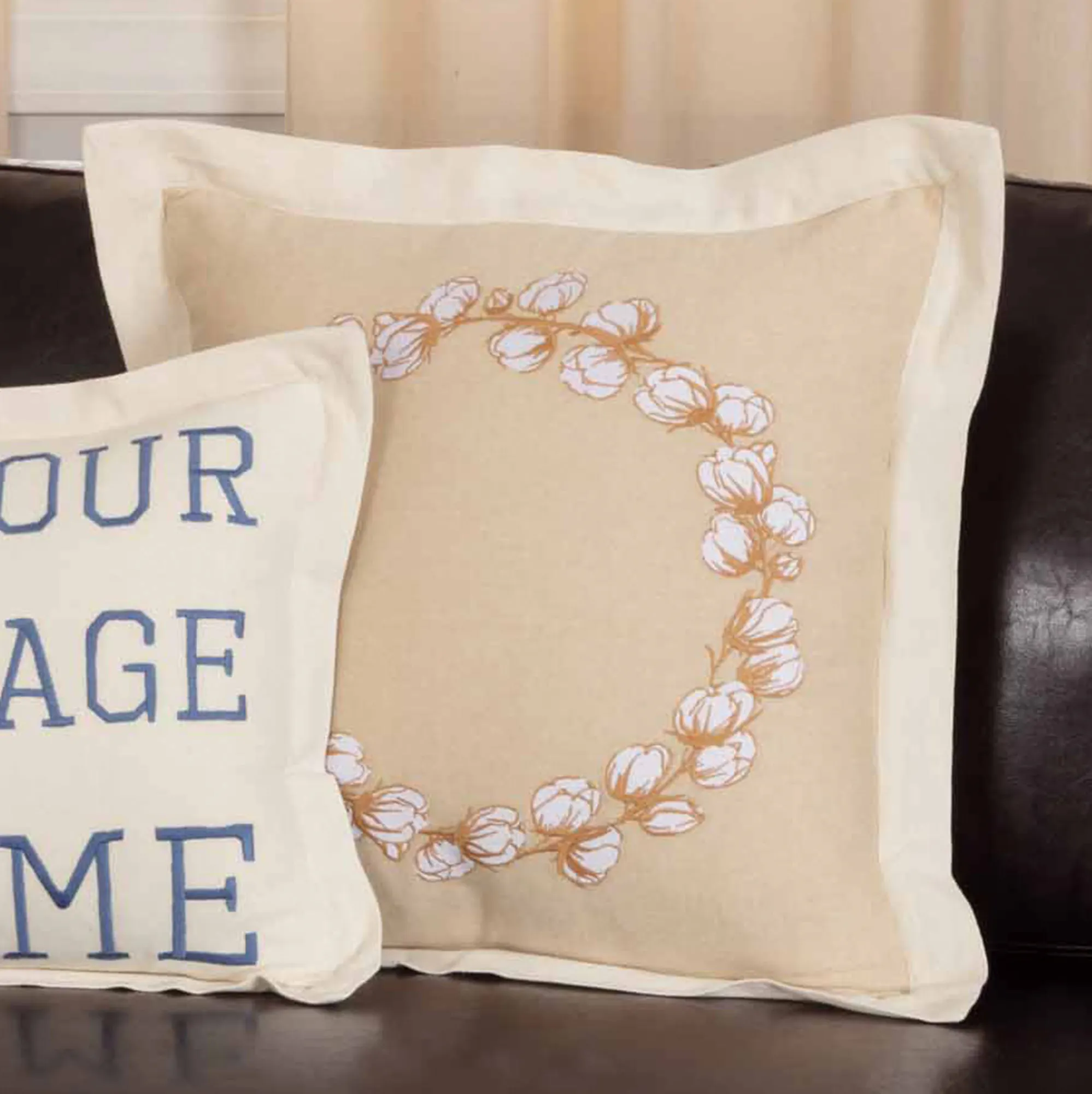 Flanged Pillows have button closures and polyester fill. Square is soft cotton chambray with an embroidered cotton sprig wreath on dark beige. Farmhouse Rectangle has "Welcome to Our Farmhouse" stenciled in black on a vintage tan cotton burlap background. The ruffled flanges have woven ticking stripes. Cotton back has woven ticking stripes. Home Rectangle has "Bless Our Vintage Home" and cotton sprig embroidery on a light cream cotton chambray background. Cotton chambray Rinehart Rectangle has "Rinehart & Co. Cotton Mill Est. 1896 Grayridge, MO" and cotton sprig embroidery on dark beige. Cotton back has woven ticking stripes.