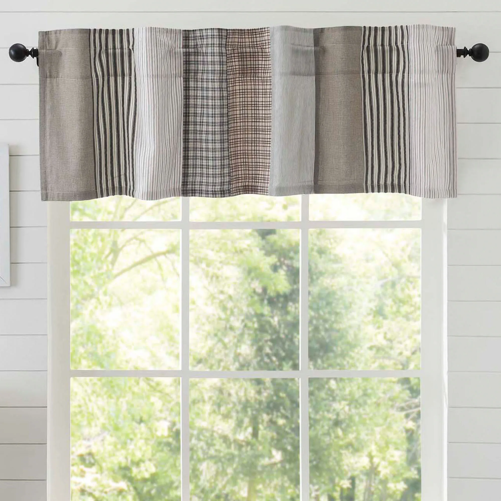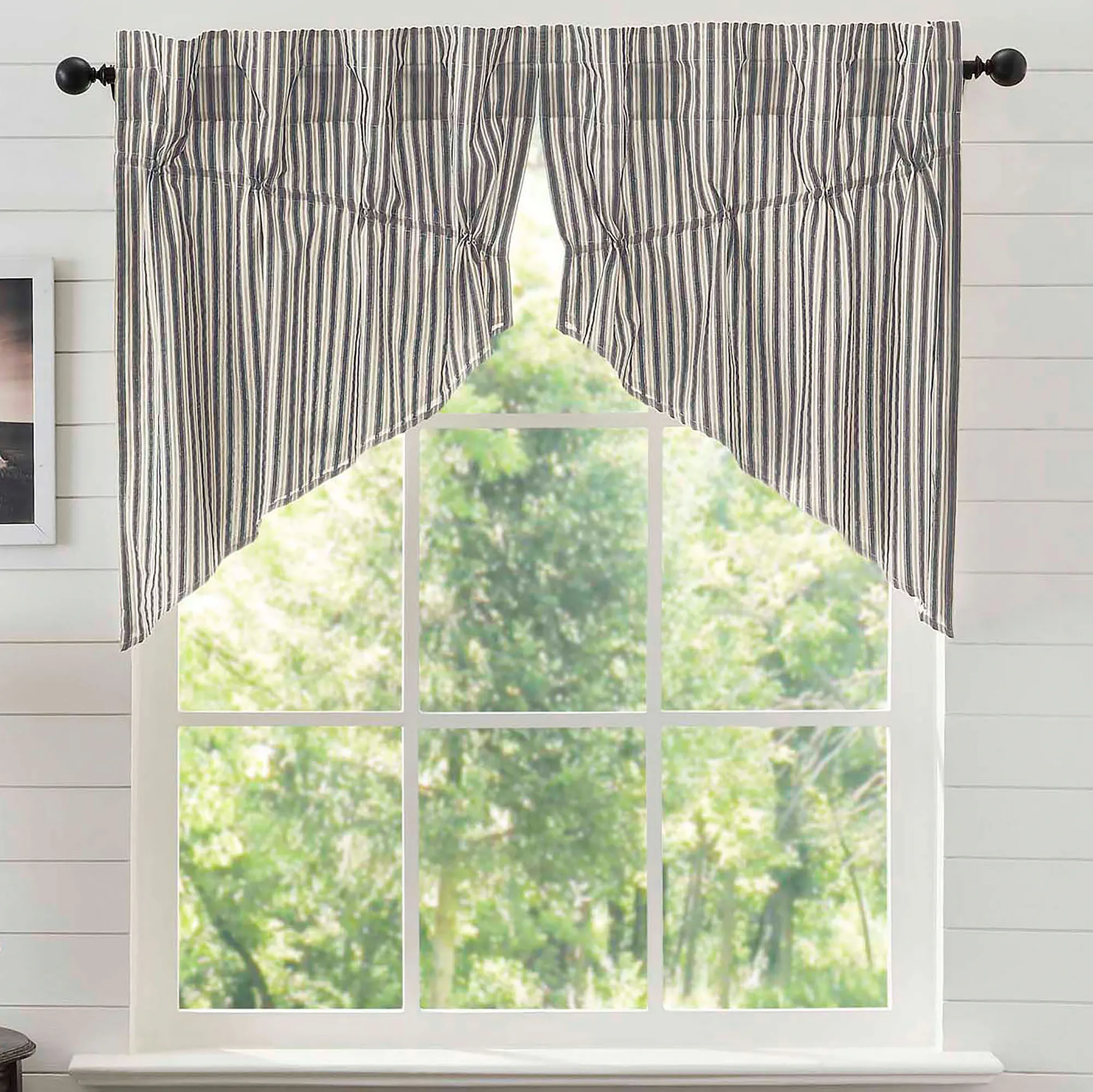 Lined Window Treatment has 3.25" rod pockets. Tailored Curtain Pair has woven ticking stripes and includes tiebacks. Curtains are available in two sizes. Prairie Curtain Pair has woven ticking stripes and built-in drawstrings for panel adjustment. Available in two lengths. Prairie Swag Valance Pair has woven ticking stripes and adjustable drawstring ties to modify the look. Tailored Valance has a patchwork pattern. Available in two widths.