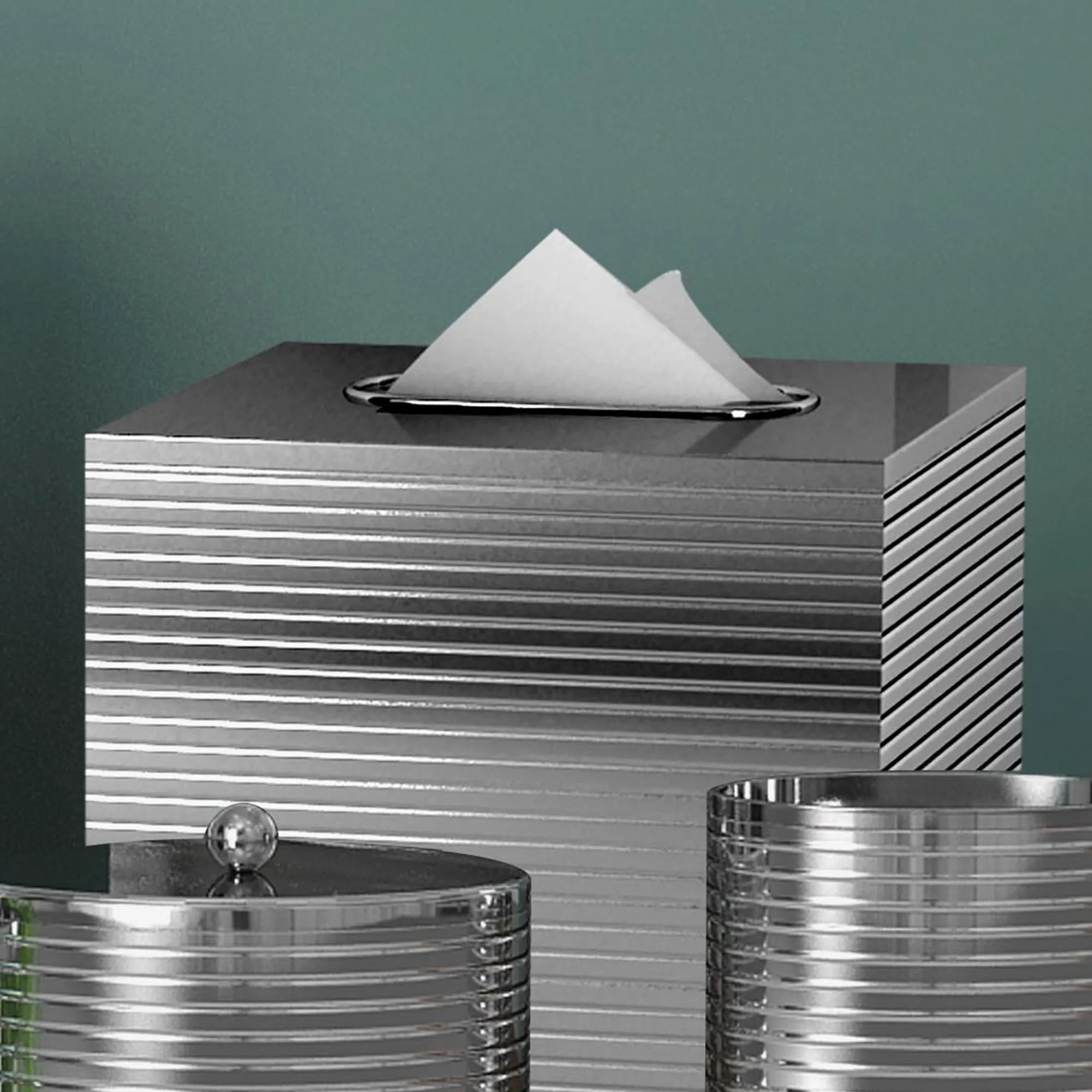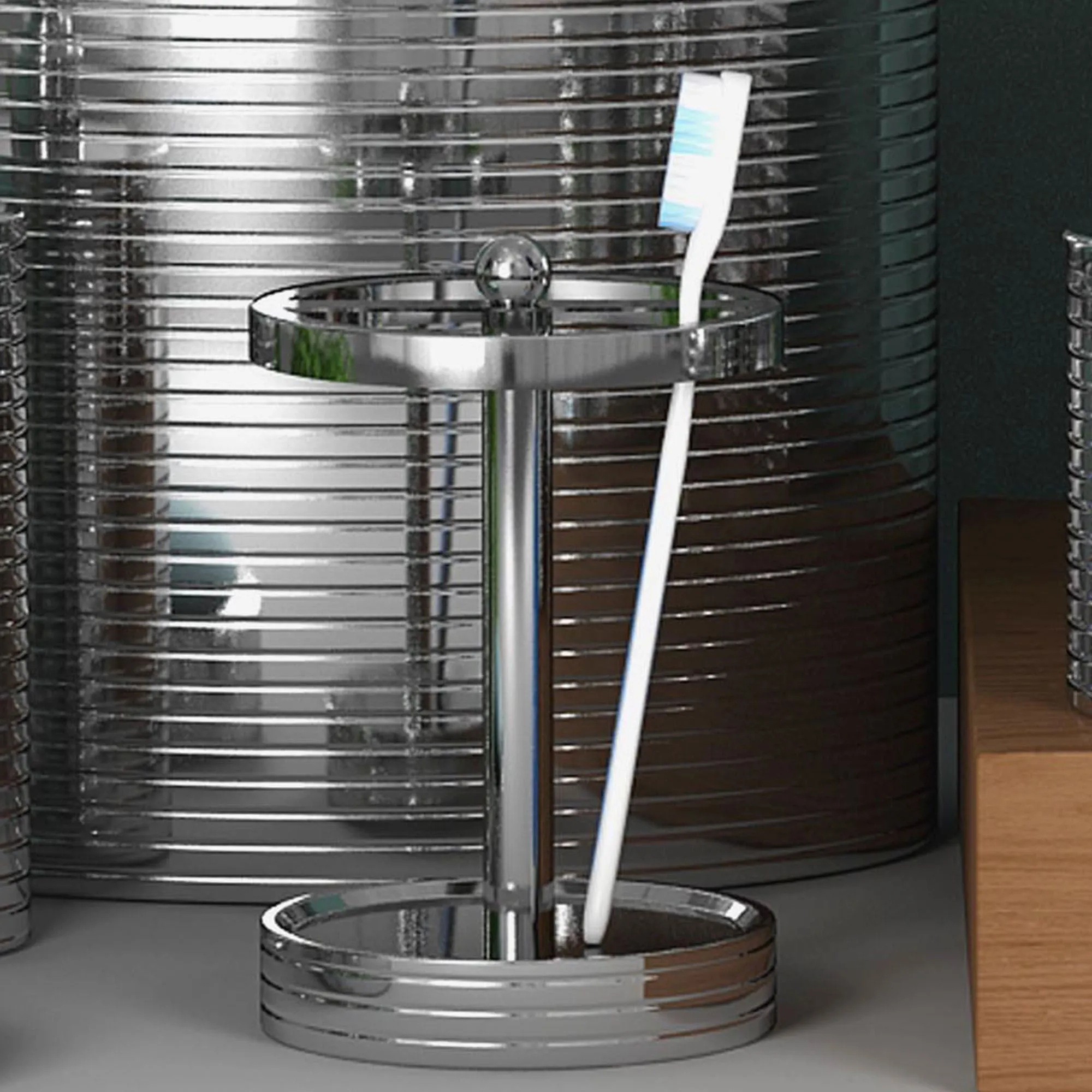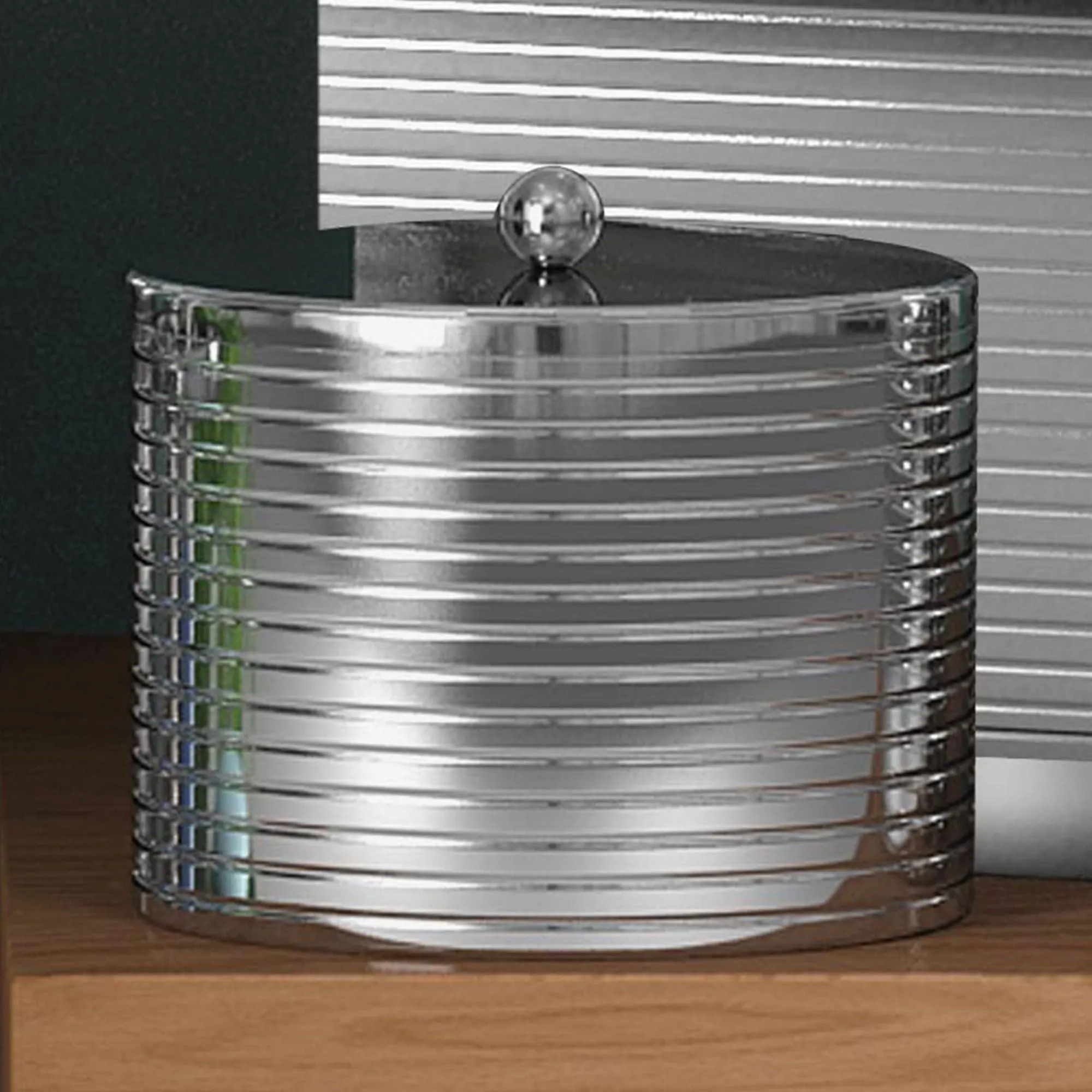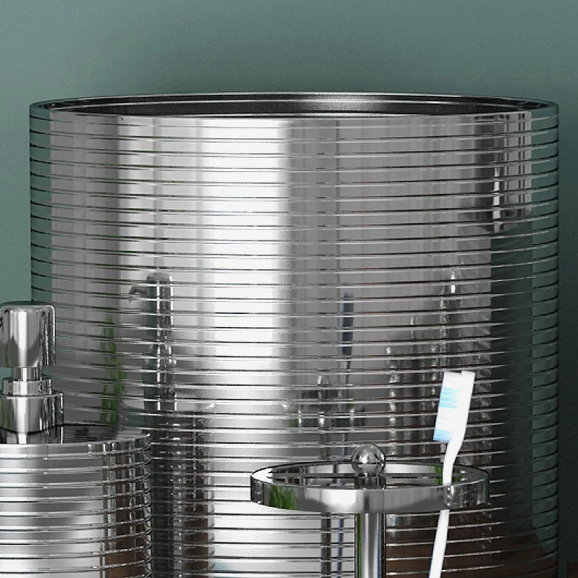 The Astoria Bath Accessories define a space with sleek sophistication. Each handcrafted steel bath accent features a striking silver hue and a ribbed design. The Brush Holder can be used to hold your toothbrushes or makeup brushes. Specify Brush Holder, Covered Jar, Lotion/Soap Dispenser, Soap Dish, Tissue Cover, Tumbler, or Wastebasket.