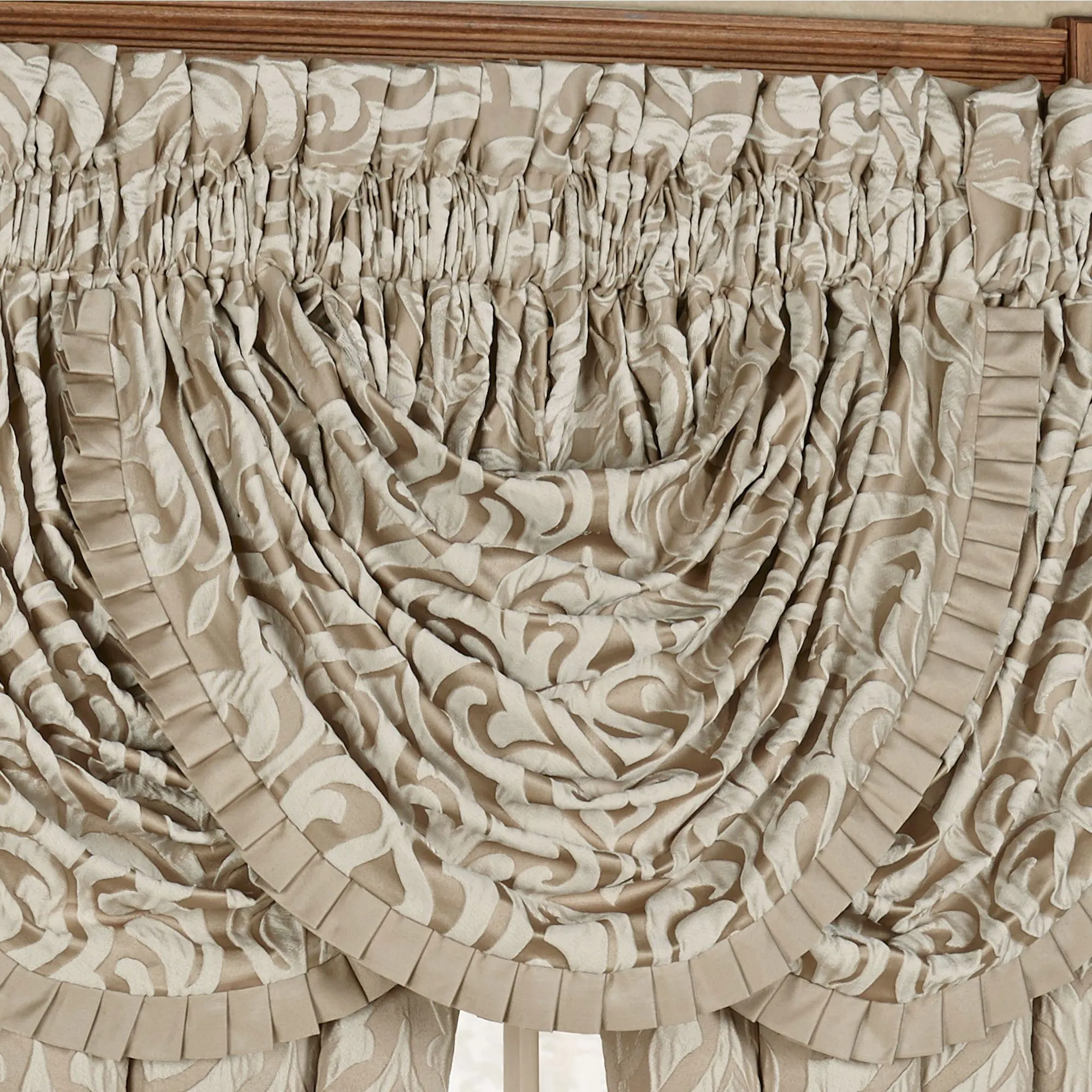 Window Treatment has 3" rod pockets. Tailored, lined Curtains mimic the comforter and include tiebacks. Wide Curtains are also available. Waterfall Valance mimics the comforter and has pleats on the bottom edge. We recommend one for every 12"-15" of window.