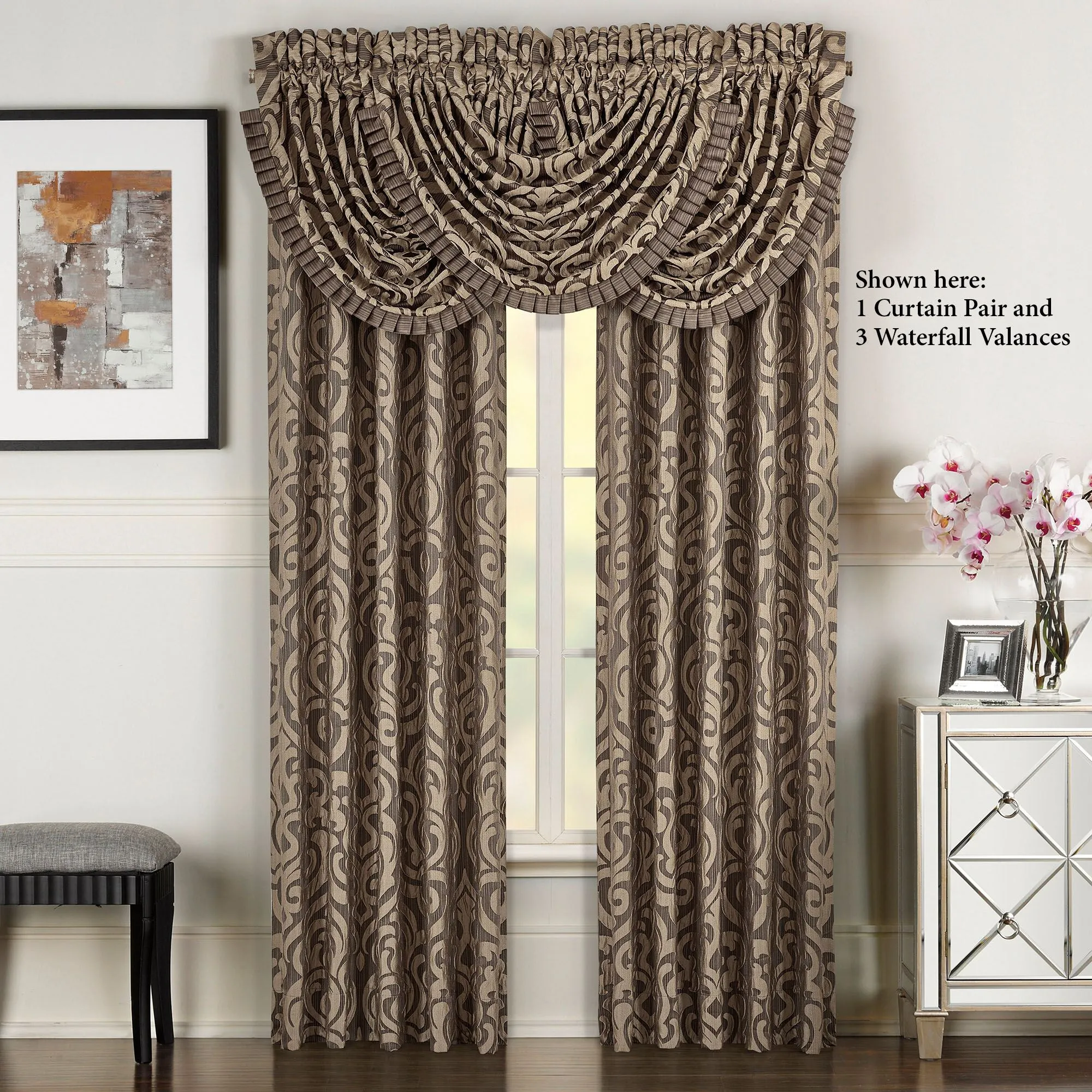 Window Treatment has 3" rod pockets. Curtain Pair, 98"Wx84"L. Each Waterfall Valance is 42"Wx33"L. We recommend one valance for every 12"-15" of window width.