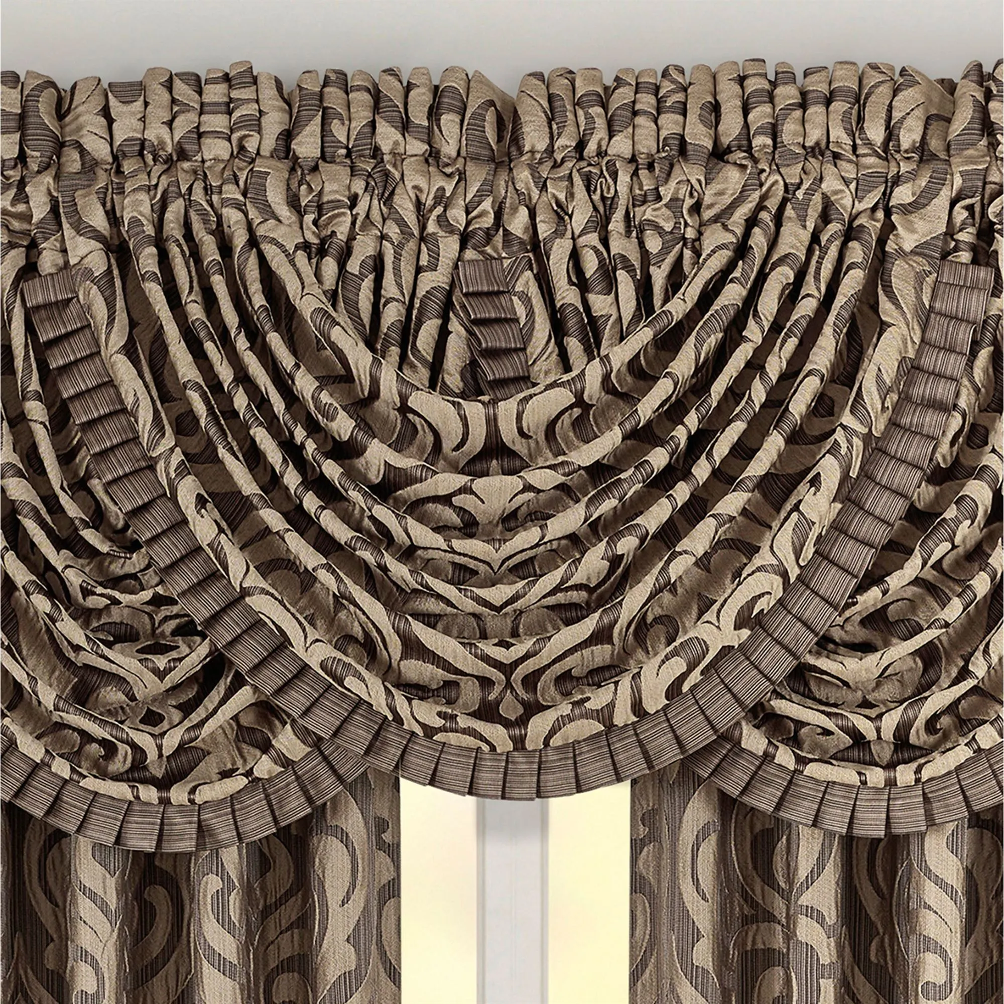 Deep neutral tones lend a sophisticated air to the Astoria Scroll Coffee Window Treatment from J. Queen New York. Polyester window treatment features dark beige puff-jacquard scrolling damask upon a jacquard-woven coffee and light brown striped ground. Window treatment has 3" rod pockets. Specify Curtain Pair or Waterfall Valance. Lined Curtains have tailored edges and include tiebacks. Waterfall Valance has a pleated edge. We recommend one valance for every 12"-15" of window width. Dry clean only. Imported. The curtain pair width is the total width of two panels together.