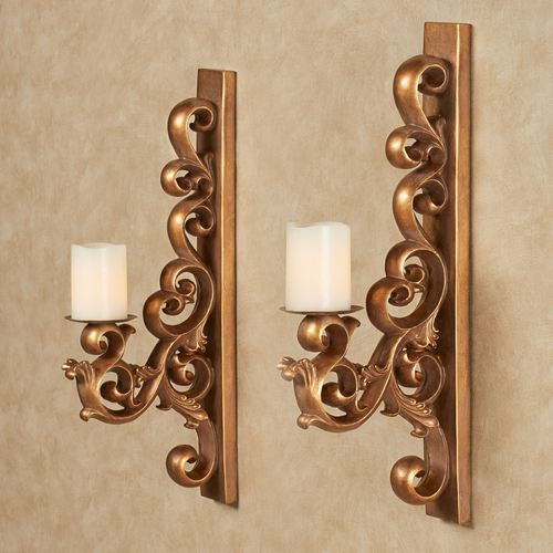 Acanthus leaves scroll with elegance on the Astrella Aged Gold Wall Sconce Pair. With a rectangle bracket design, each resin sconce features grand openwork scrollwork that holds a metal candlecup for your 3" dia. candle. Each is 4"Wx10"Dx24"H.