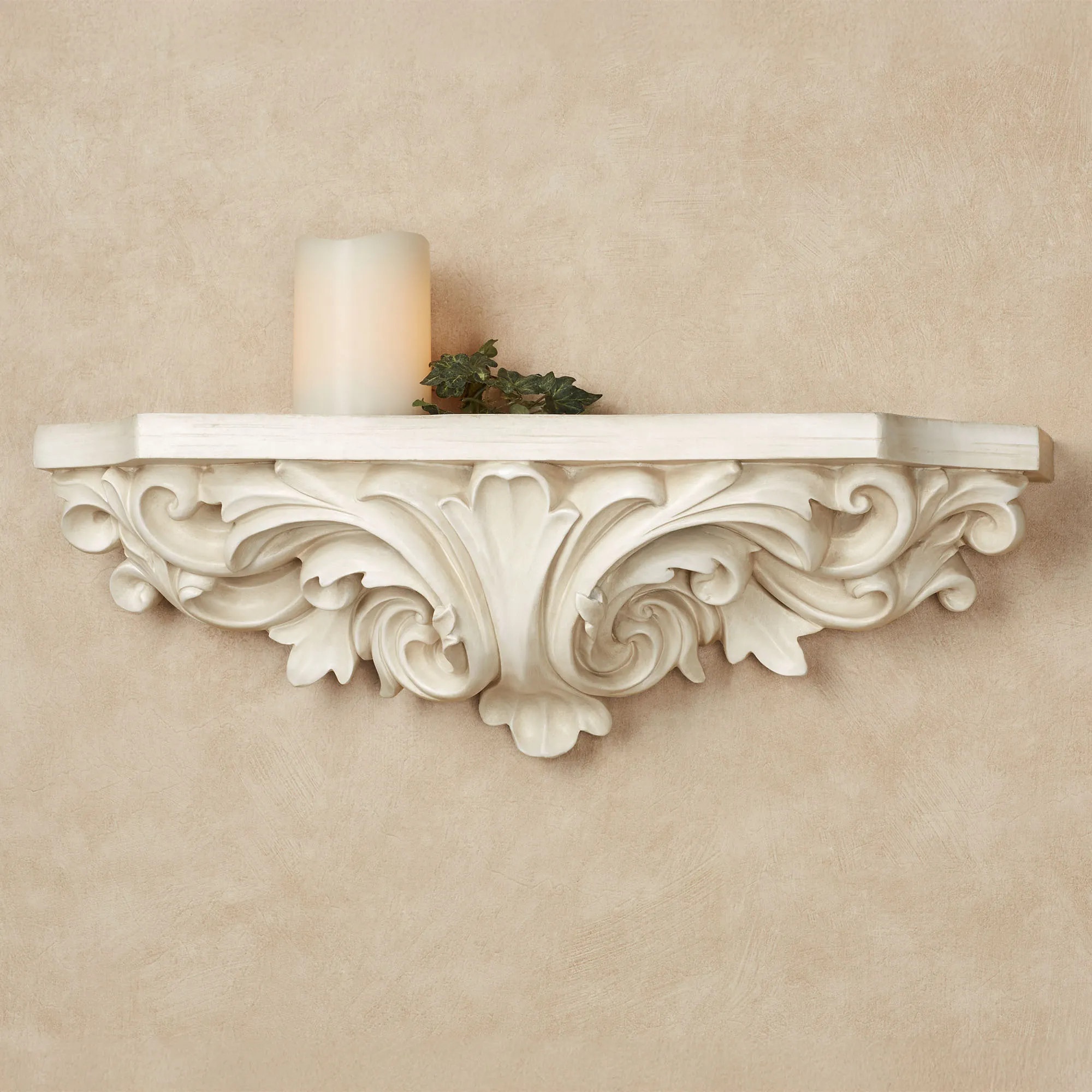 Acanthus leaves flow with elegance on the Astrella Wall Shelf. Resin wall accent has an antique white finish. Top has a woodgrain look. Measures 22"Wx6"Dx7"H.