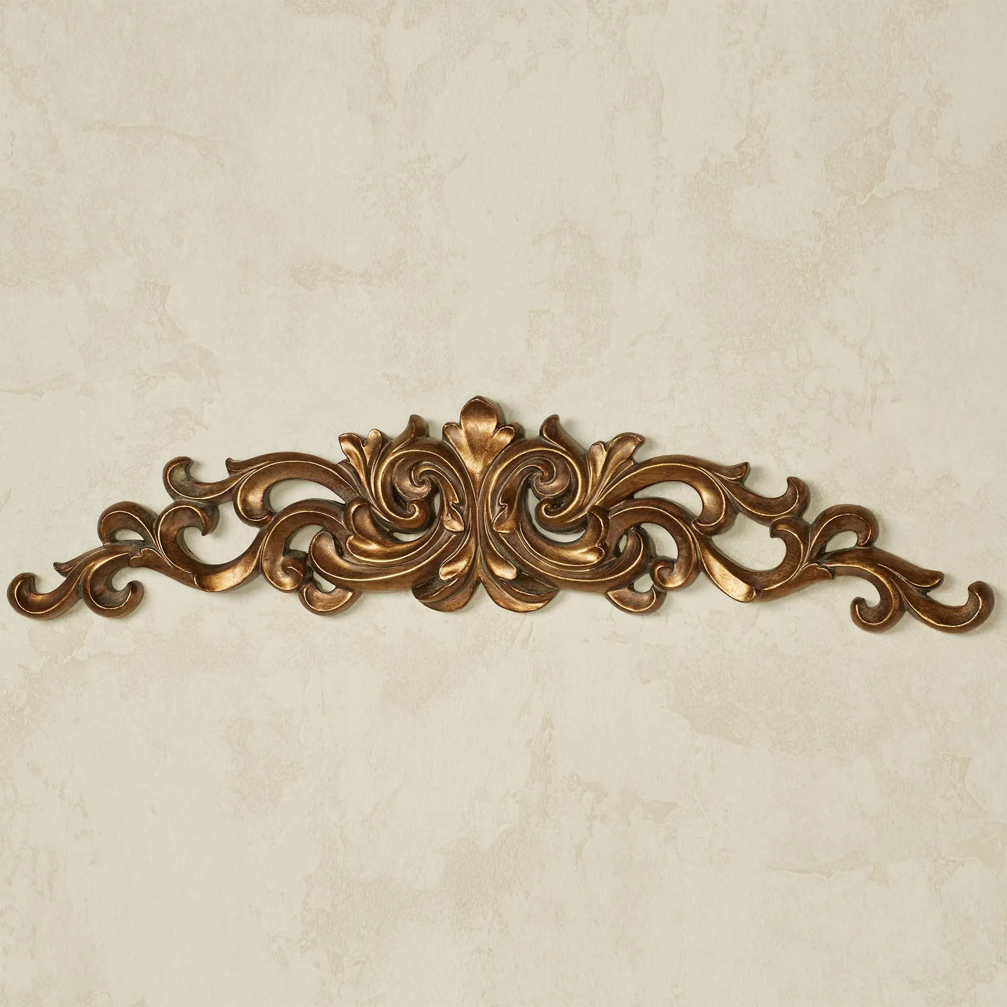 Adorn a doorway or favorite photo with the classic grace of the Astrella Wall Topper. With a center fleur-de-lis and an aged gold finish, the resin wall accent features an openwork scrolling acanthus leaf design. Measures 26"Wx1.5"Dx6"H.