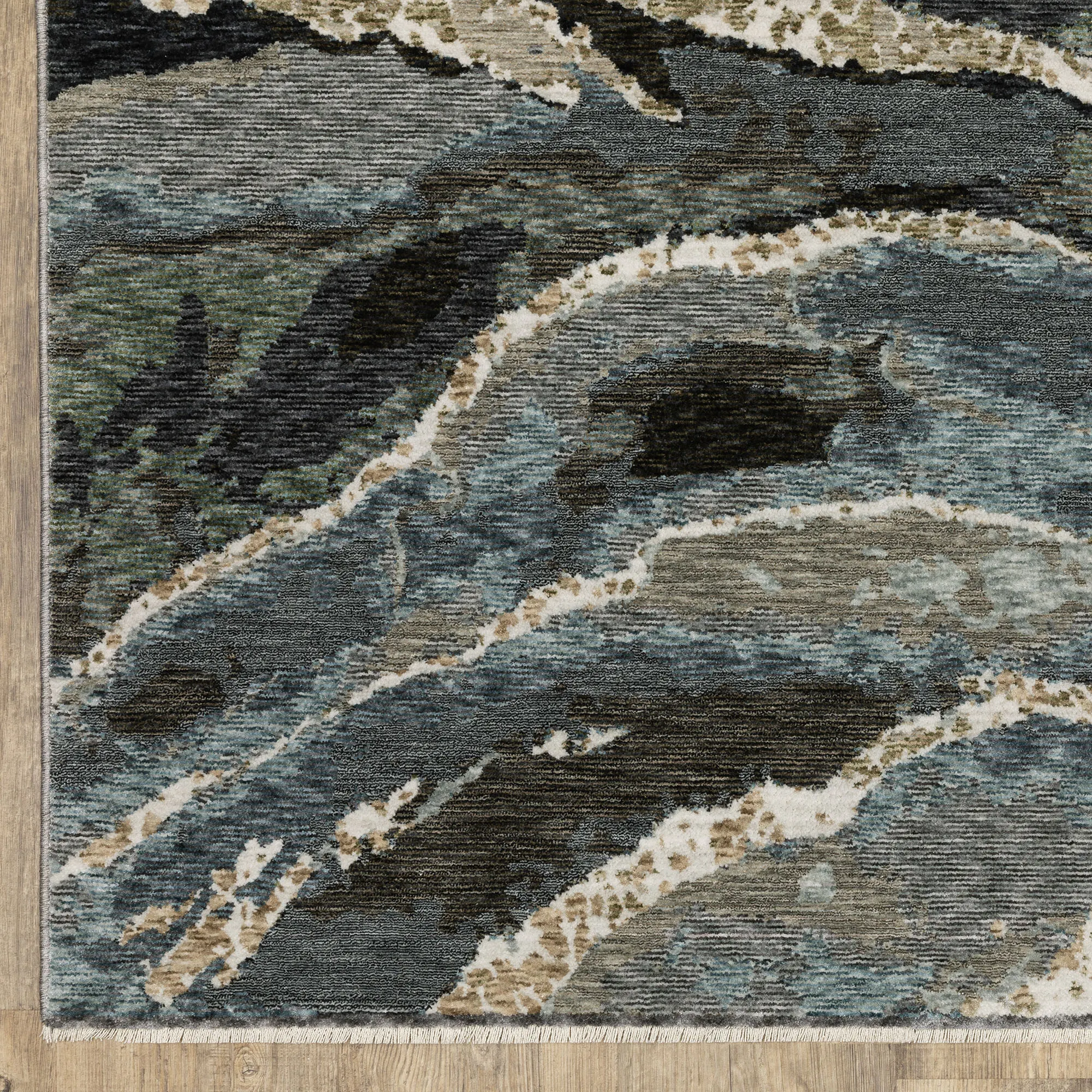 Waves of deep color lap upon the Astros Rug like water against the shore. Power-loomed from soft polyester, the .32" thick textured rug features an abstract, variegated, space-dyed design in shades of off-white, ivory, cream, tan, light taupe, dark blue, pale aqua, indigo, dark teal, gray, black, blue-green, and amber. Ivory fringed ends, .5"L, add further charm. Backing is woven polyester. We recommend professional cleaning by a rug cleaner. Imported.