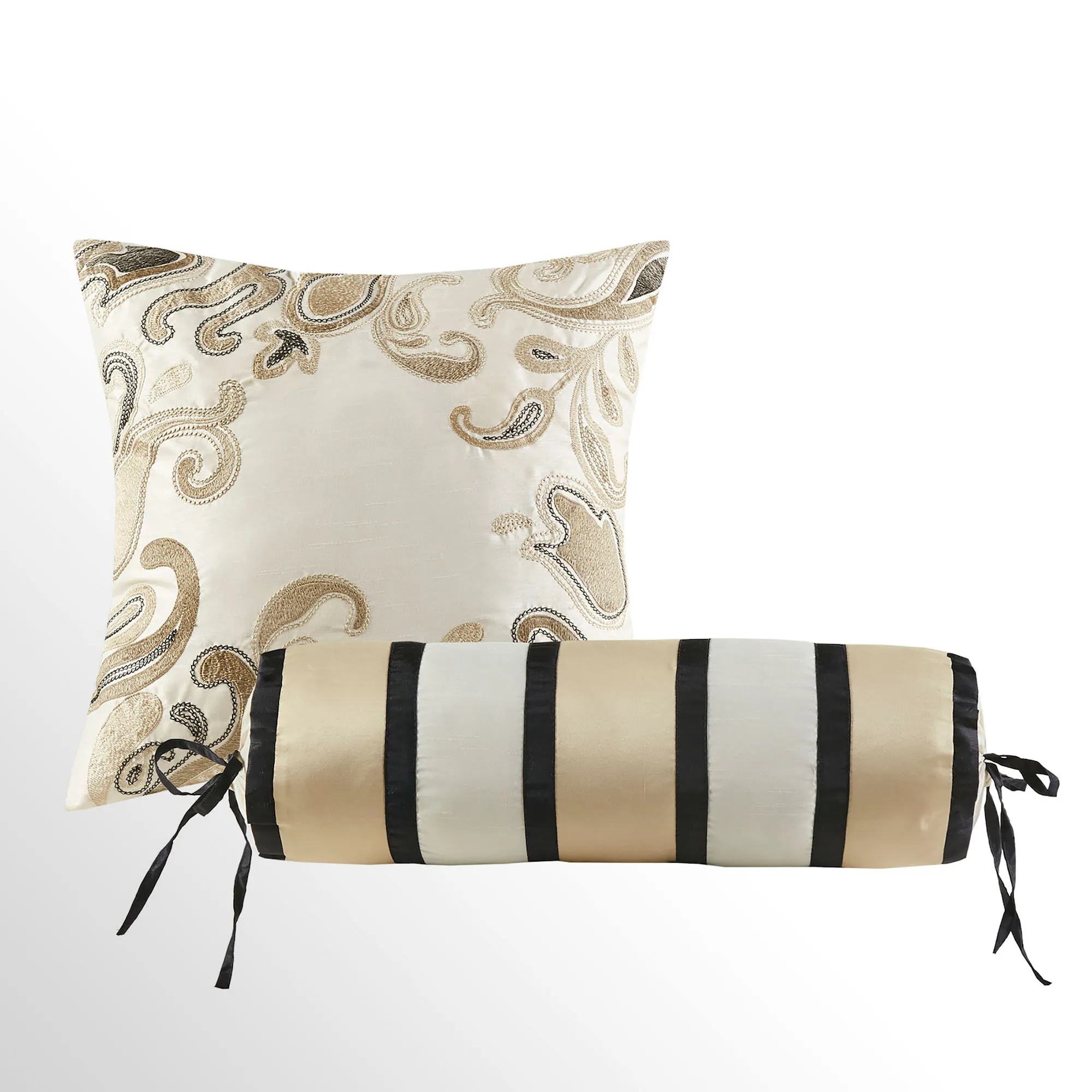 The Aubrey Black 5-Piece Bed Set by Madison Park includes a bedspread, 2 shams, 1 square pillow, and 1 neckroll pillow. The sophisticated, polyester bedspread features ornate jacquard-woven paisley motifs in shades of silver, taupe, black, almond, and light cream. The bedspread also has vermicelli quilting, a gold mini pleat, a mitred-corner border, and a solid almond backing. Click on the Details tab to read about the other items in the bed set. Fill is a cotton blend; pillows have polyester fill. Machine washable; spot clean the pillows. Imported.