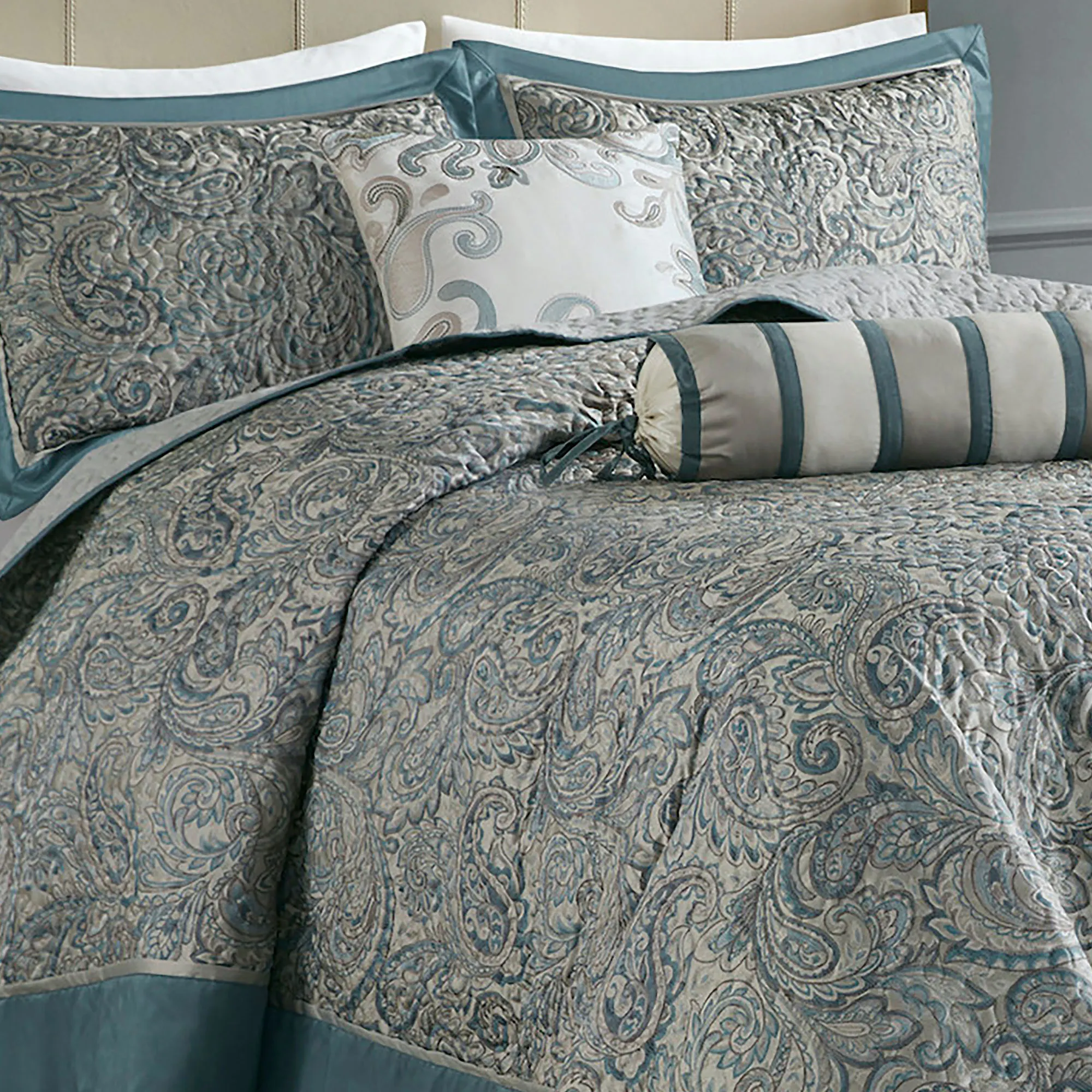 The Aubrey Teal 5-Piece Bed Set by Madison Park includes a bedspread, 2 shams, 1 square pillow, and 1 neckroll pillow. The sophisticated, polyester bedspread features ornate jacquard-woven paisley motifs in shades of soft teal, aqua, gray, and charcoal. The bedspread also has vermicelli quilting, a mini pleat, a mitred-corner border, and a solid gray backing. Click on Details to read about the other items in the bed set. Fill is a cotton blend; pillows have polyester fill. Machine washable; spot clean the pillows. Imported.
