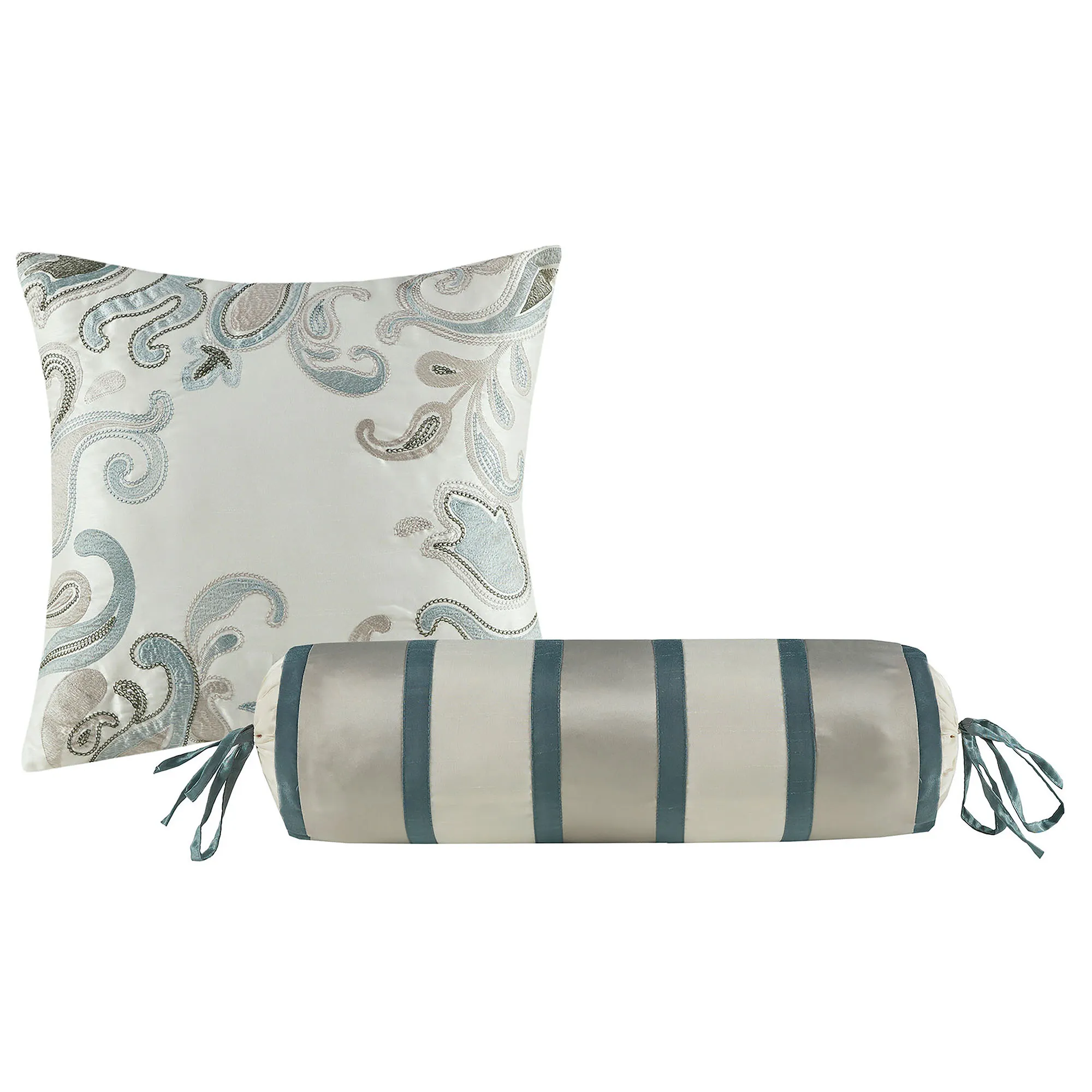 The tailored square pillow is solid platinum with paisley embroidery. The tailored neckroll pillow has pieced bands in coordinating colors and tie ends.