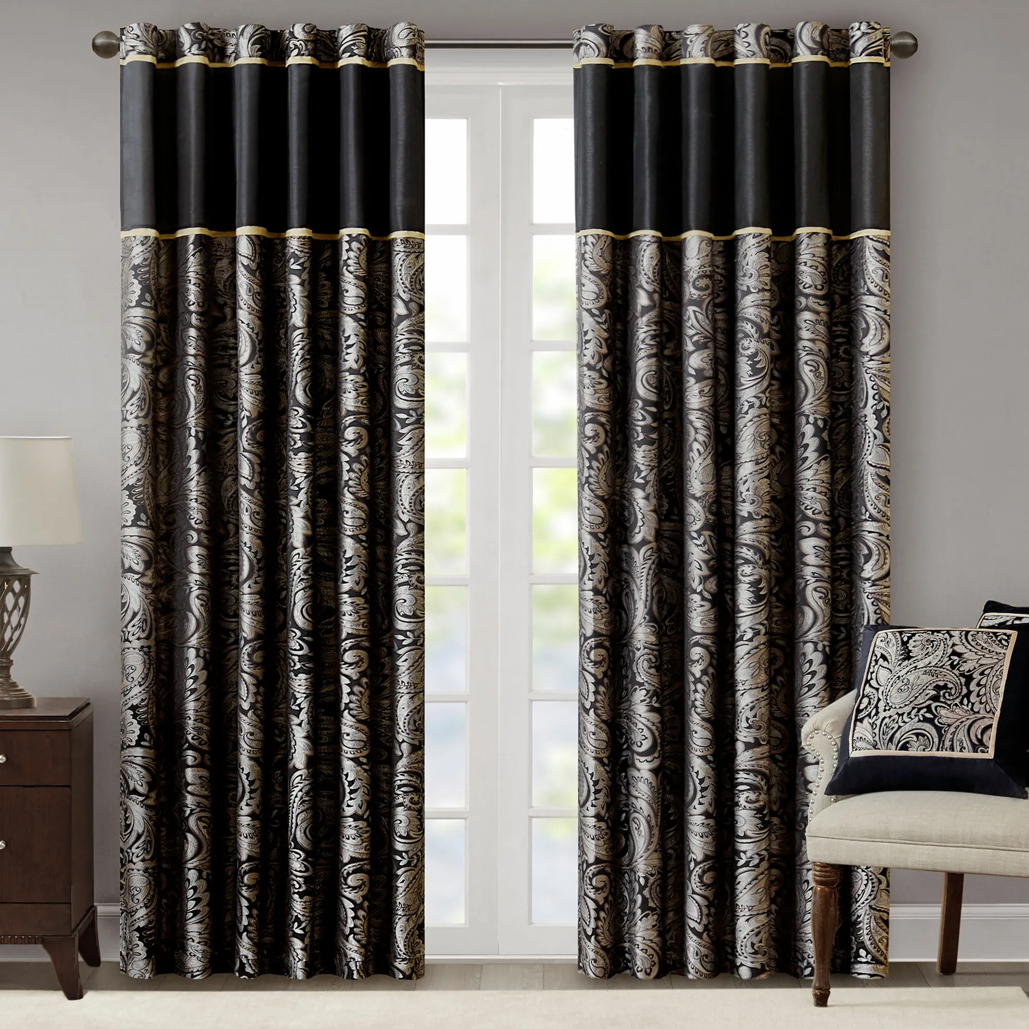 The Aubrey Black Window Treatment dazzles your space with elaborate panache. By Madison Park, the jacquard-woven polyester window treatment features flourishing paisley designs accented by a solid trimmed band. The black coloration contains dark beige, ecru, and light taupe designs and a black band trimmed in dark beige. Each window treatment is finished with tailored edges and a 3" rod pocket. Specify Wide Curtain Pair or Tailored Valance. Wide Curtain Pair, 100"W, has a large trimmed band near the top. Valance, 50"Wx18"L, has a trimmed band on the edge. Machine washable. Imported. The curtain pair width is the total width of two panels together.