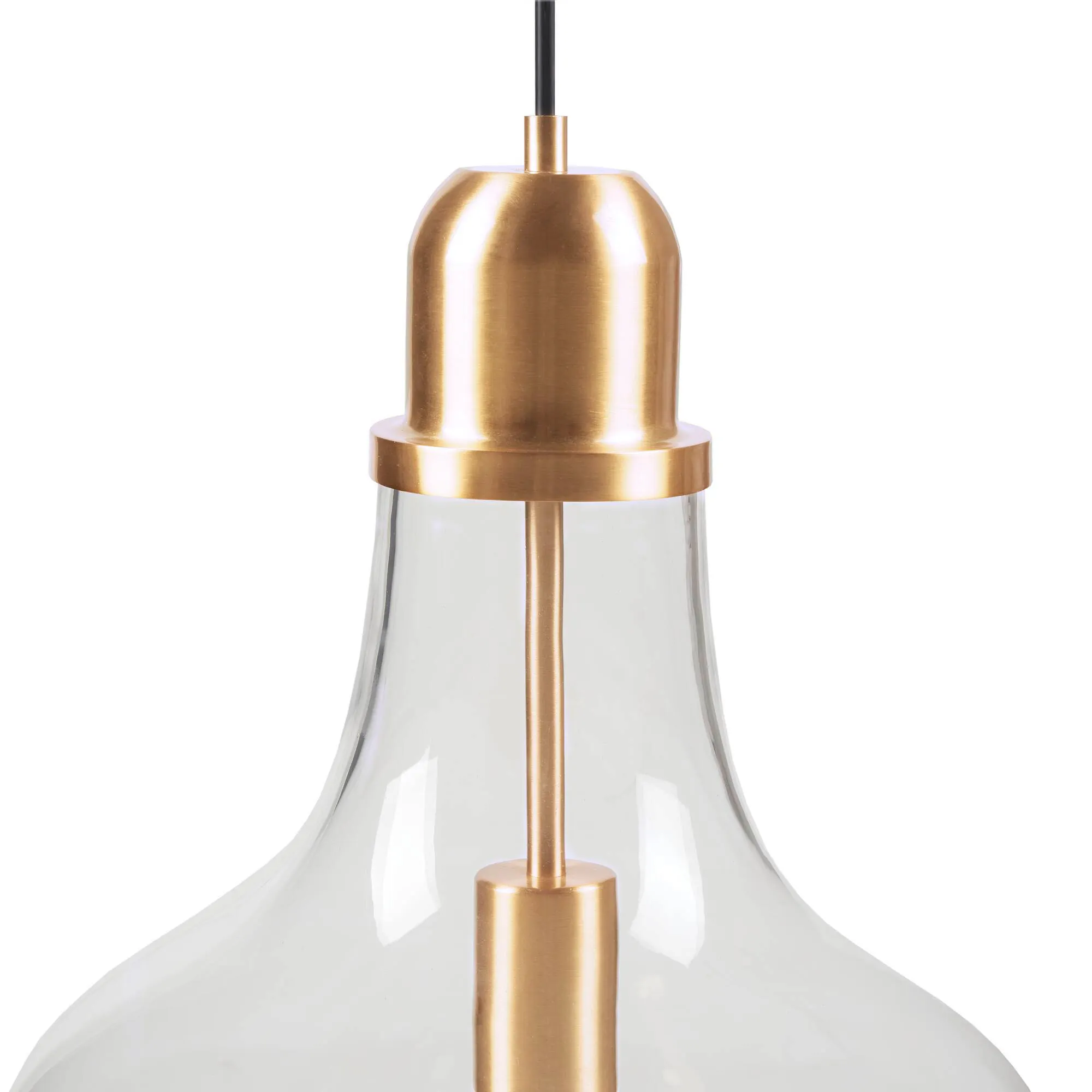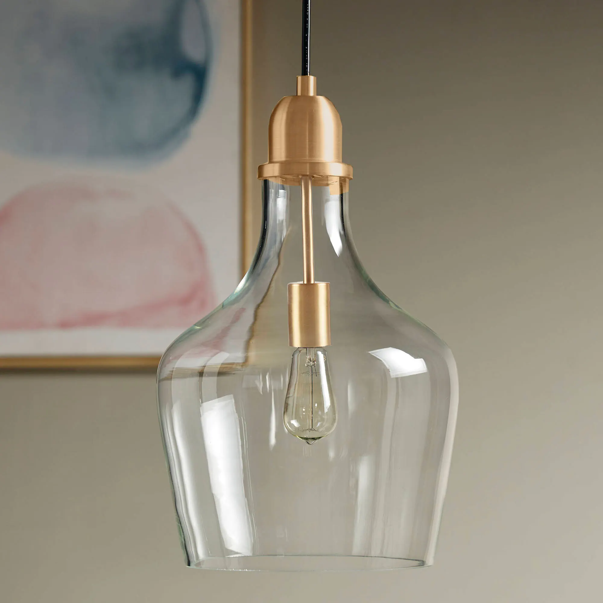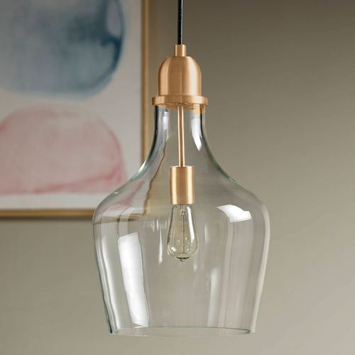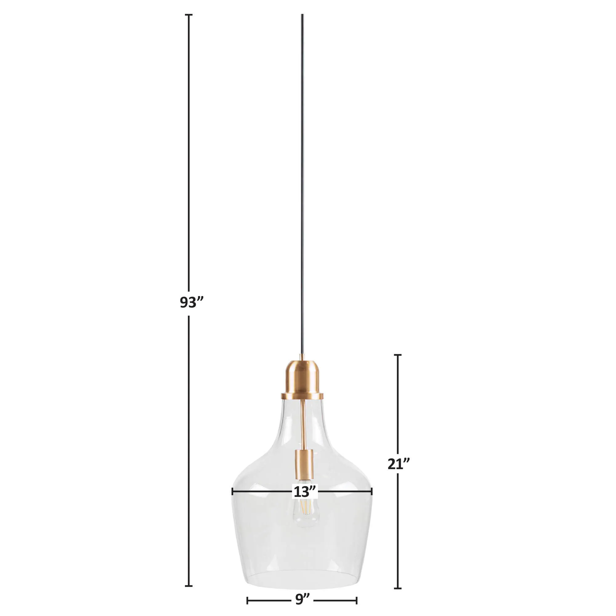 The Auburn Pendant Light provides a classic, chic look. Adorned with gold-finished metal, the ceiling light features a clear, bell-shaped glass shade for a simplistic, eye-catching style. UL listed. Requires one 60W max. bulb. Hardwiring is required; hardware is included. Two-year limited warranty. With an included adjustable cord and total length of 93"L, the pendant light measures 13"dia.x21"H.