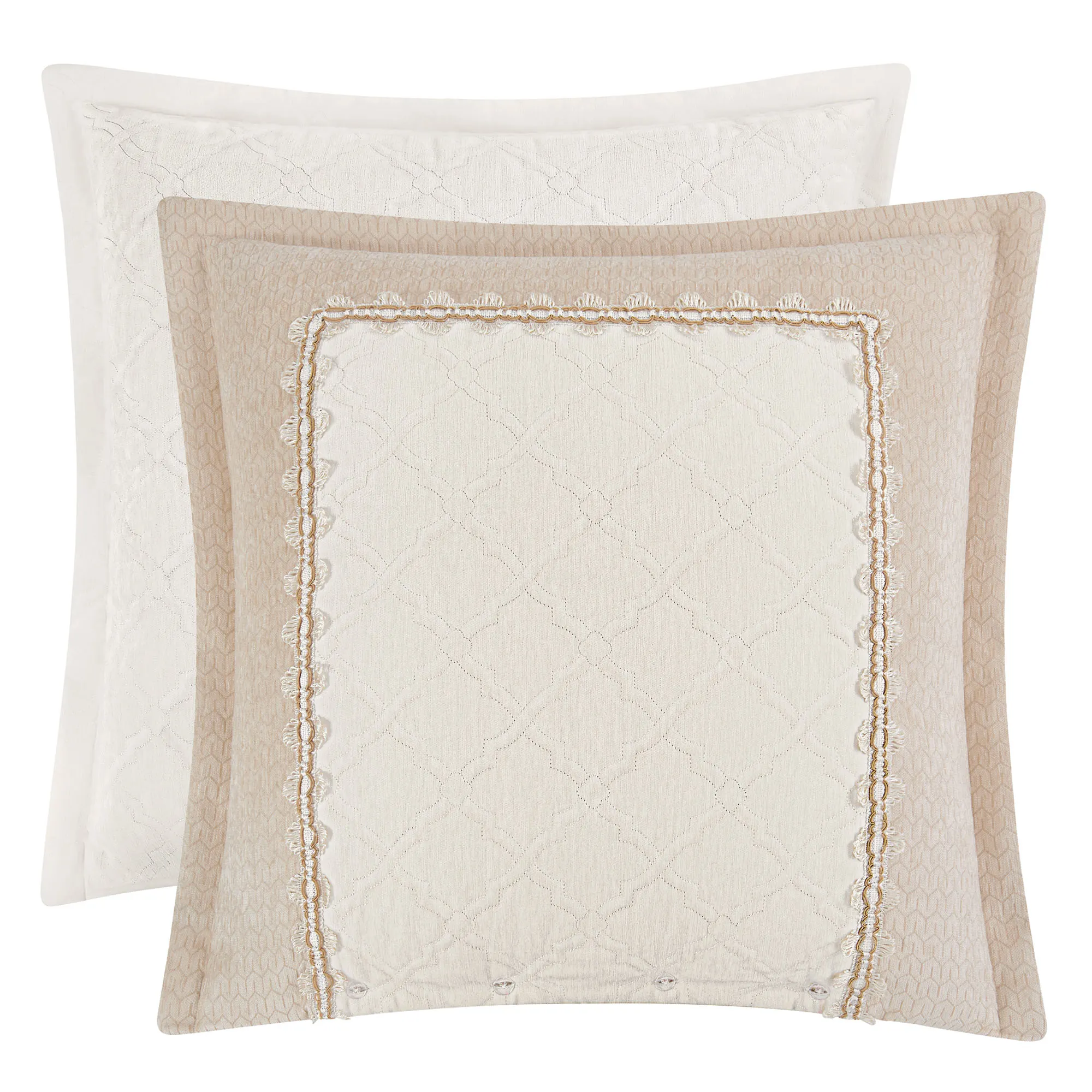 European Sham has a latticework-quilted ivory center framed in gimp trim, beige chenille, and flanged edges; reverses to lattice-quilted ivory; button closure. Dry clean only.