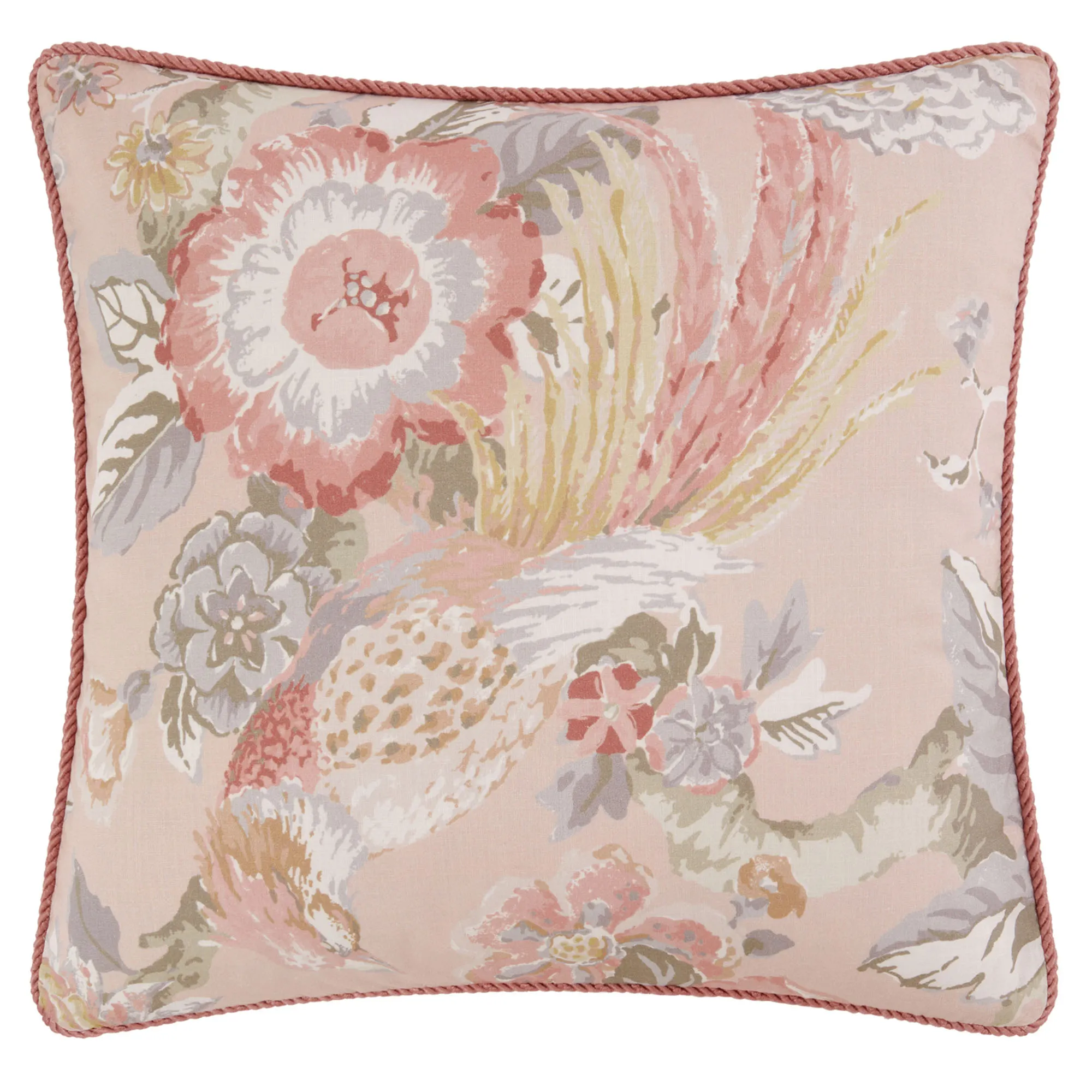 Envision exotic gardens with the Audrey Floral Comforter Bedding from Rose Tree. The cotton comforter features blossoms, flowering buds, and wild pheasants in a printed color palette of pink, blush, gray, green, gold, beige, and white on slubbed rose quartz. Oversized comforter has a twist-cording frame and flanged edges; backed in rose quartz cotton. Fill is polyester. Machine washable; dry clean the bedskirt. Imported.