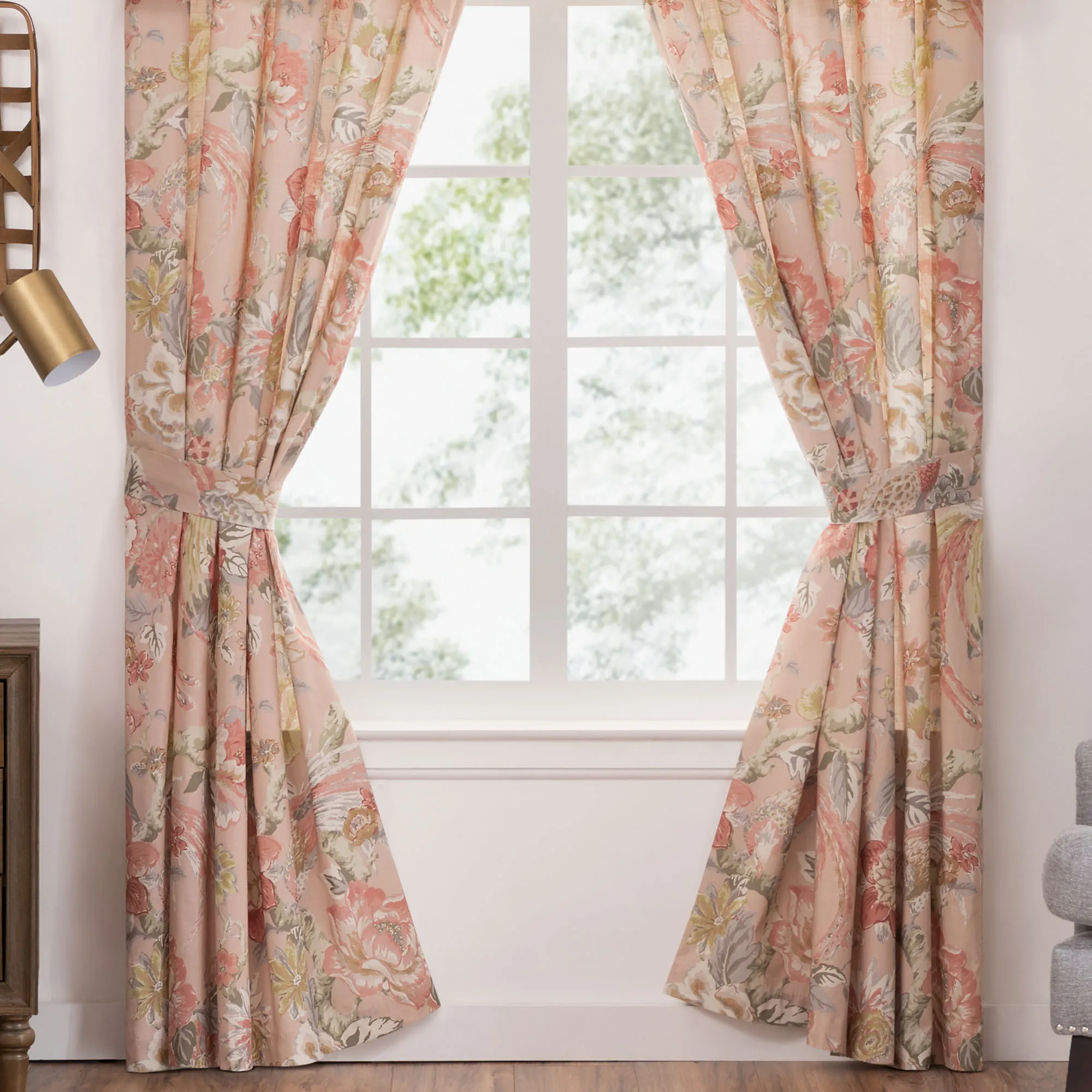 Lined Window Treatments have florals, tailored edges, and 3" rod pockets. Wide Curtain Pair includes tiebacks. Valance is also available.