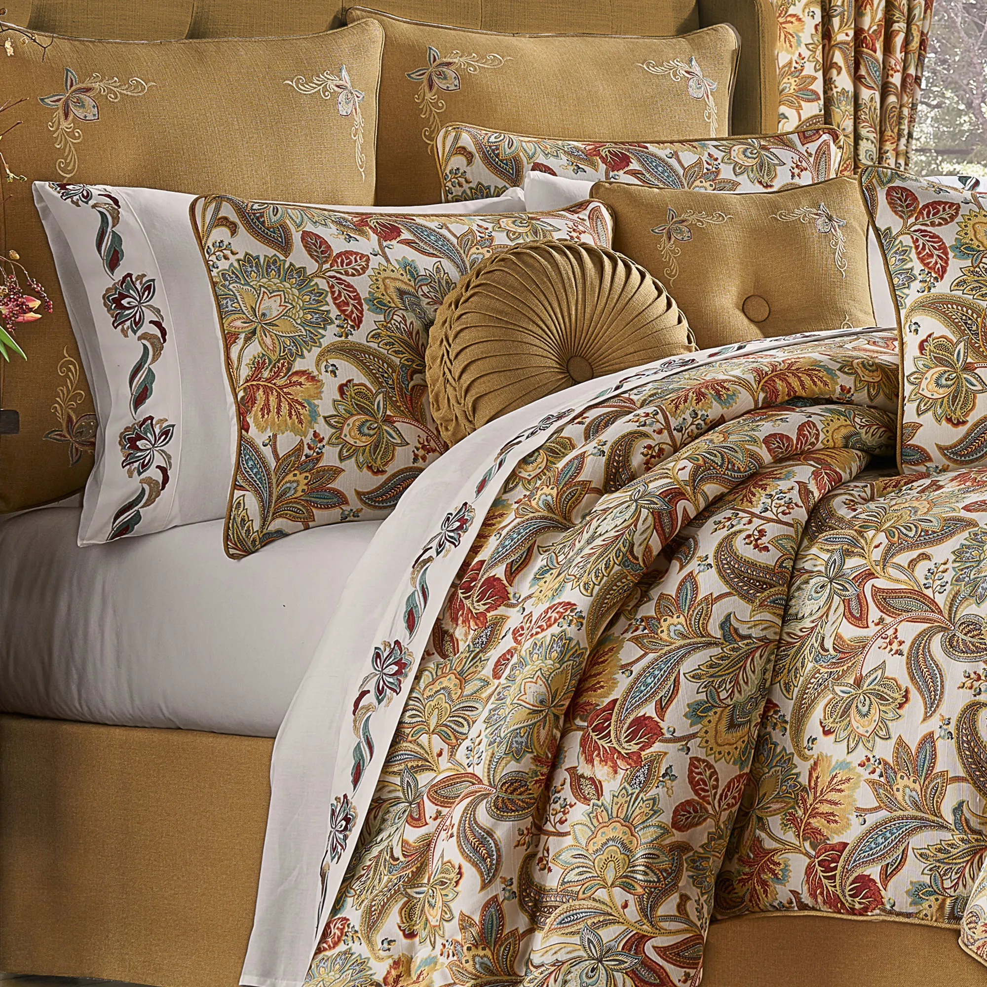 Settle in for animated, colorful dreams with the August Jacobean Floral Bedding by Five Queens Court. Oversized, piped, cotton comforter features printed Jacobean motifs in shades of cream, brown, chocolate, caramel, golden yellow, gold, orange, red, pale blue, aqua, dark teal, ecru, and mint with metallic gold accents. Comforter backing is color-matched microfiber. Bedding fill is polyester. Machine wash. Imported. Sorry, the round pillow and tufted square pillow shown are not available.