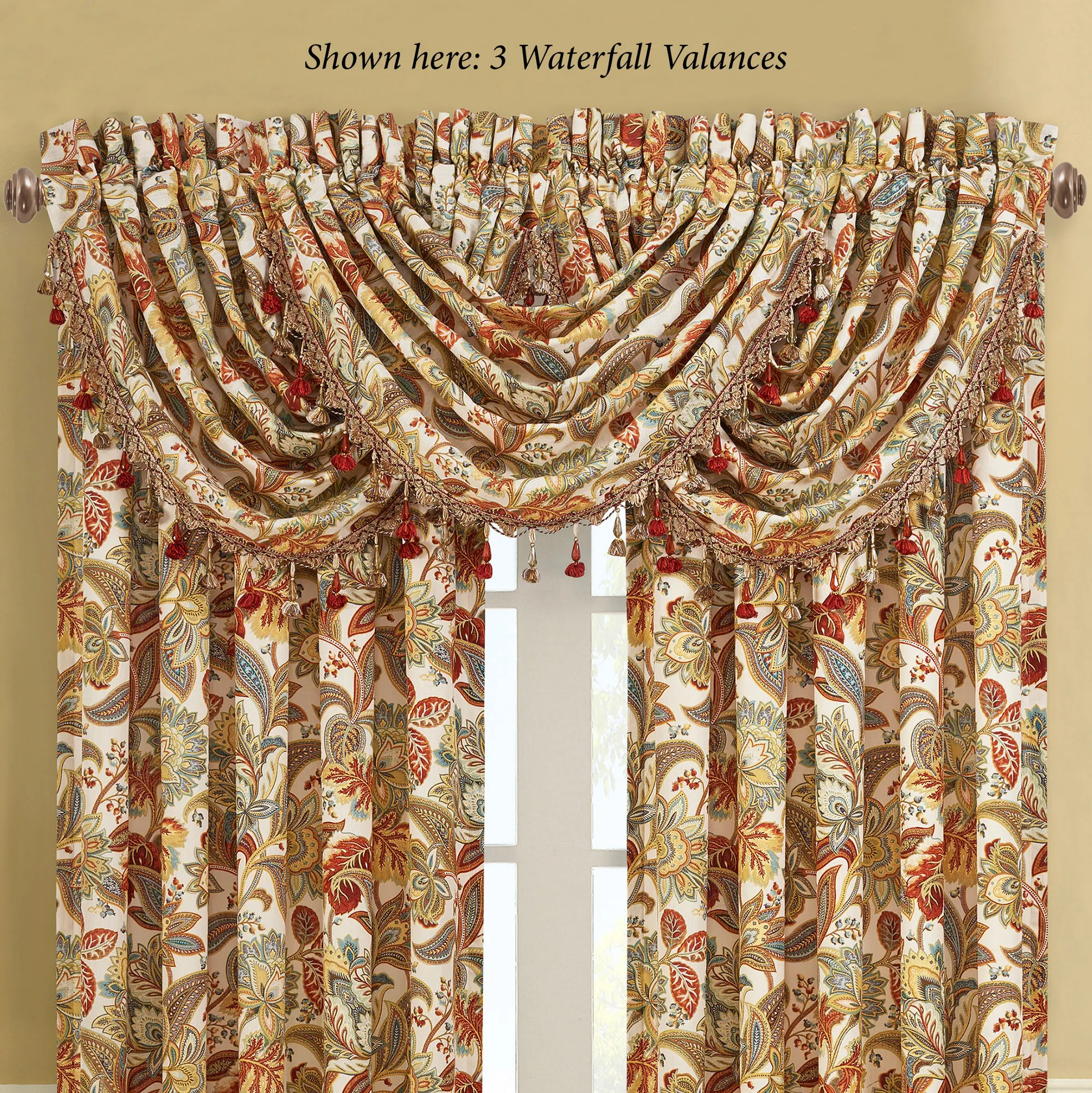 Lined Window Treatment has printed Jacobean motifs. The tailored Wide Curtains include tiebacks and have a 3" rod pocket. Curtains are available in two lengths. Each Waterfall Valance has crystal tassel fringe on the ends. Rod pocket is 3.25". We recommend one valance for every 12"-15" of window width.