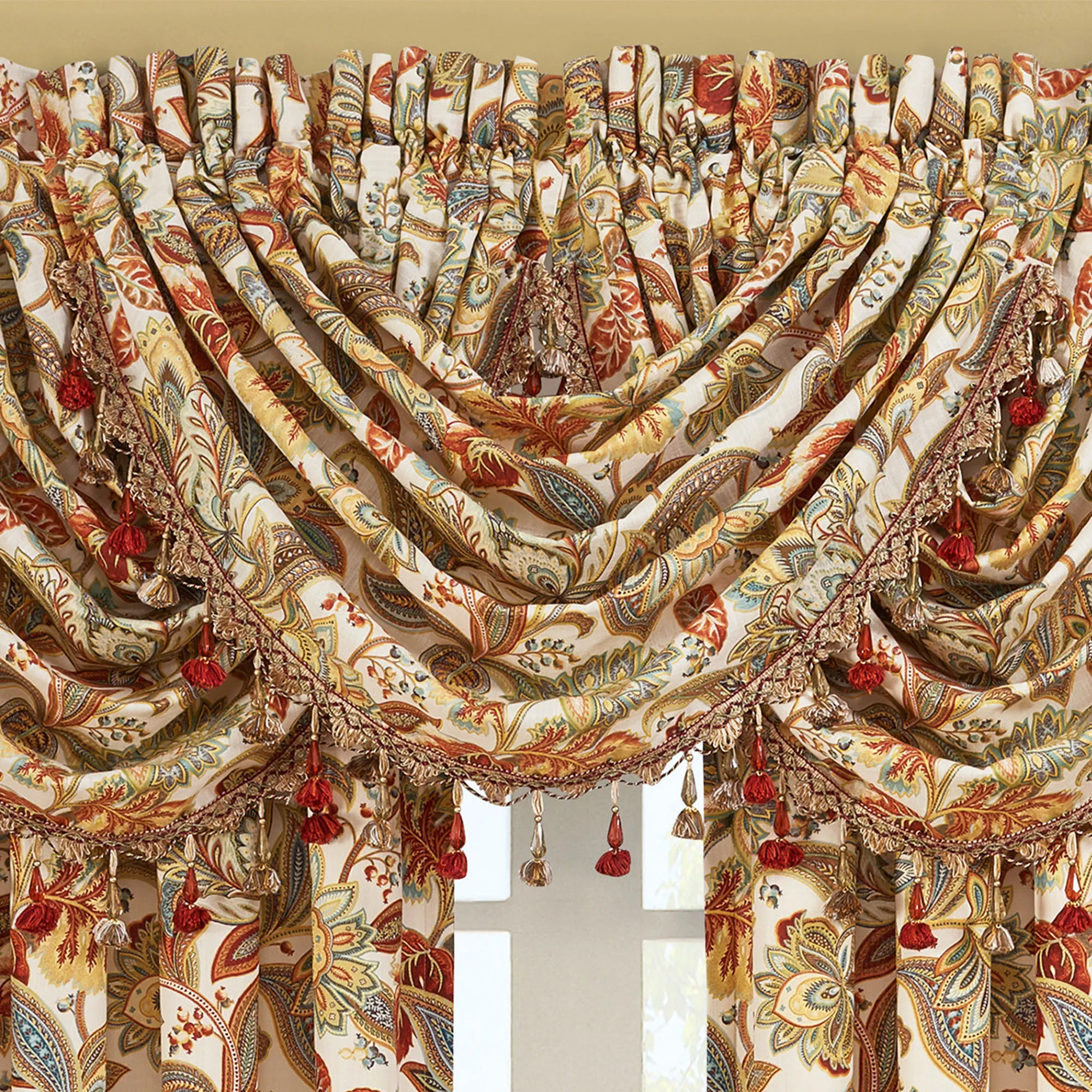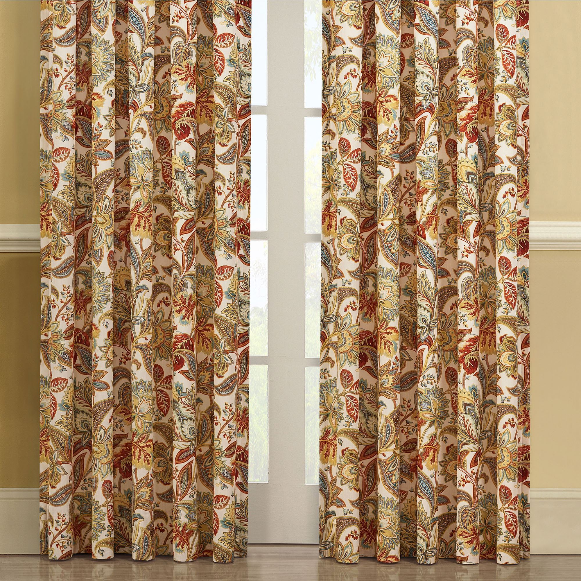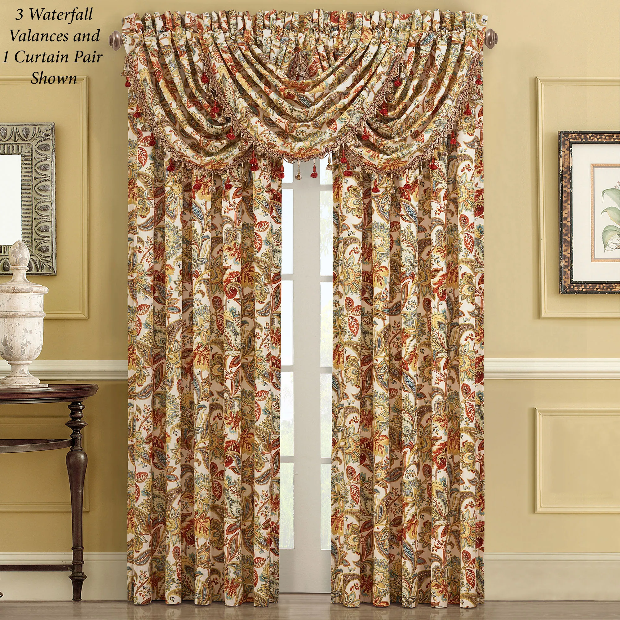 Enliven your room with the August Window Treatment by Five Queens Court. The lined, cotton window treatment has printed Jacobean floral motifs in shades of cream, brown, chocolate, caramel, golden yellow, gold, orange, red, pale blue, aqua, dark teal, ecru, and mint with metallic gold accents. Specify Waterfall Valance or Wide Curtain Pair. Each Waterfall Valance has crystal tassel fringe on the ends. Rod pocket is 3.25". We recommend one valance for every 12"-15" of window width. The tailored Wide Curtains include tiebacks and have a 3" rod pocket. Machine wash. Imported. The curtain pair width is the total width of two panels together.