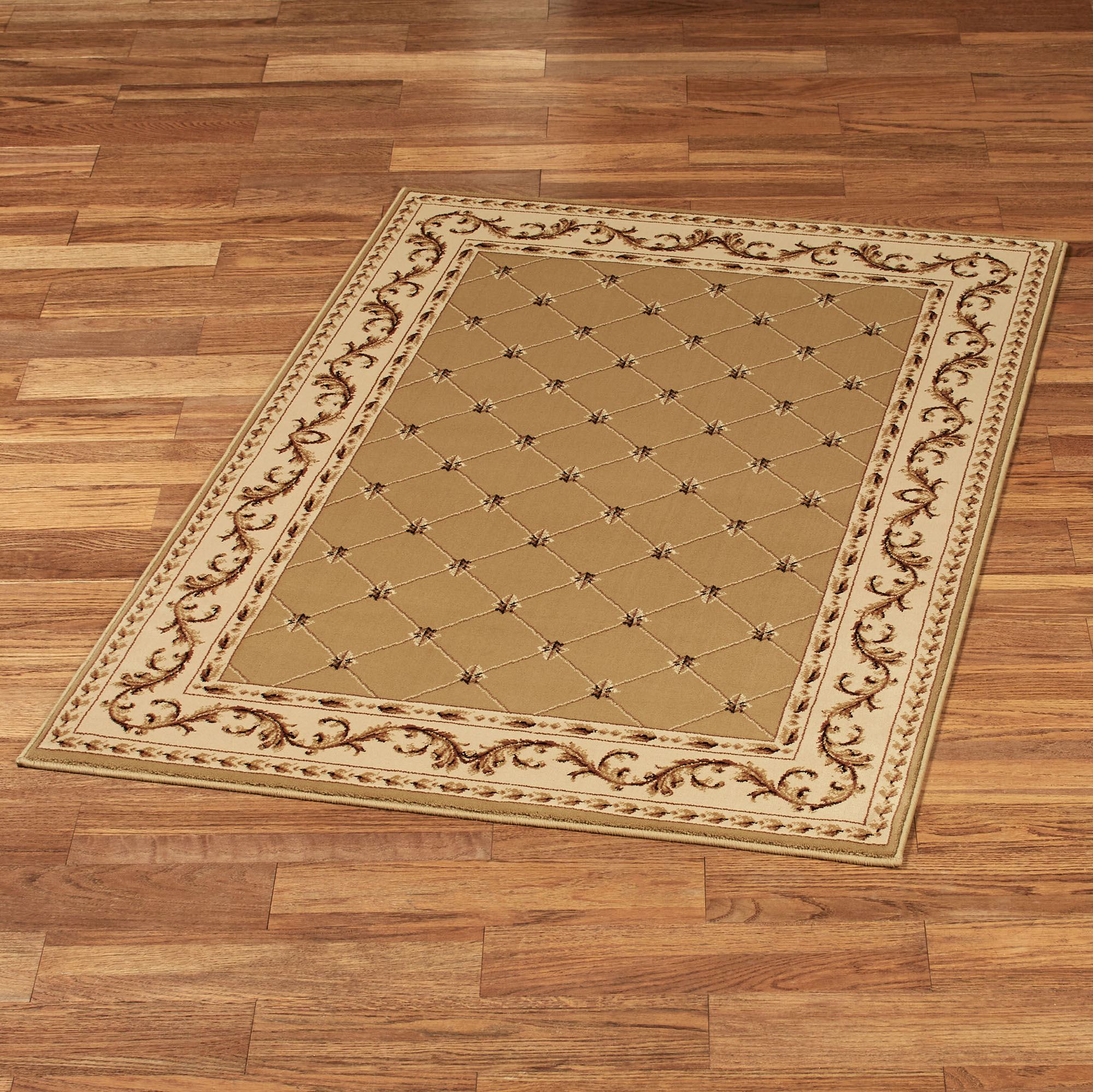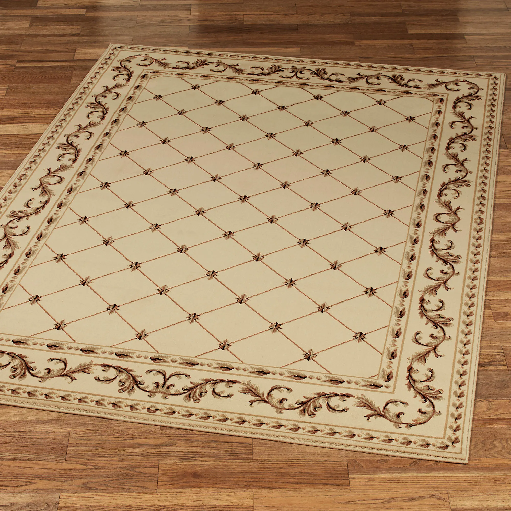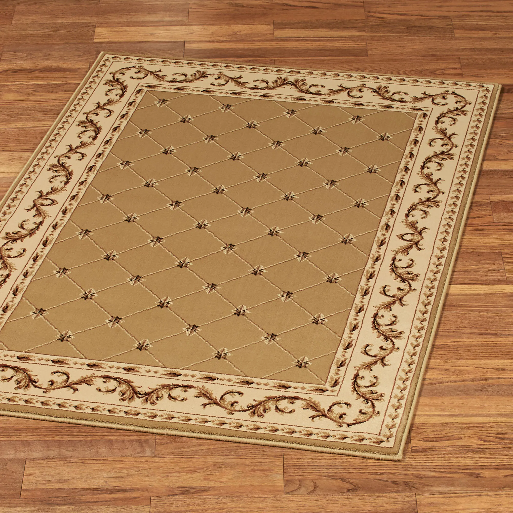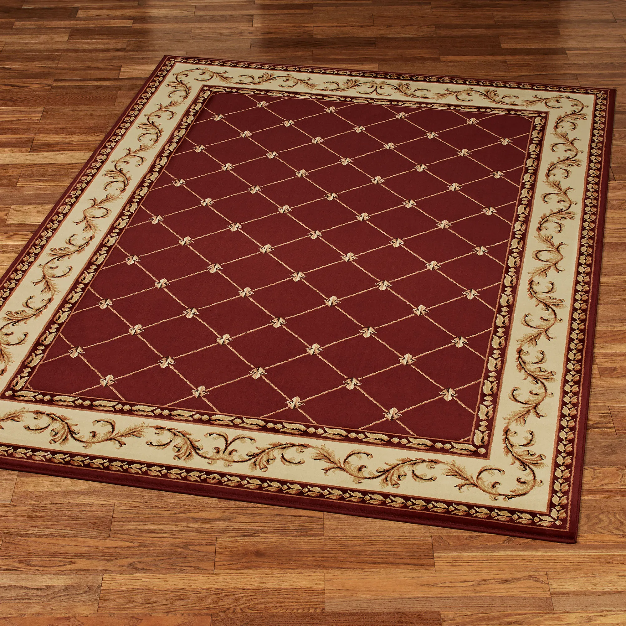 The Augusta Area Rug uses time-honored, traditional motifs to create an aesthetic of regal elegance. This machine-made polypropylene area rug, .32" thick, features a lattice pattern of fleurs-de-lis on a solid color background, surrounded by a border of leafy scrollwork. Accent colors include beige and gold. We recommend professional cleaning by a rug cleaner. Imported.