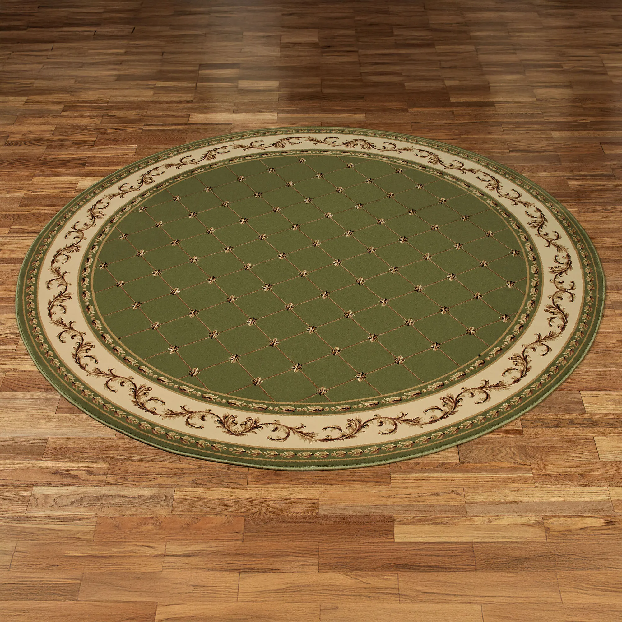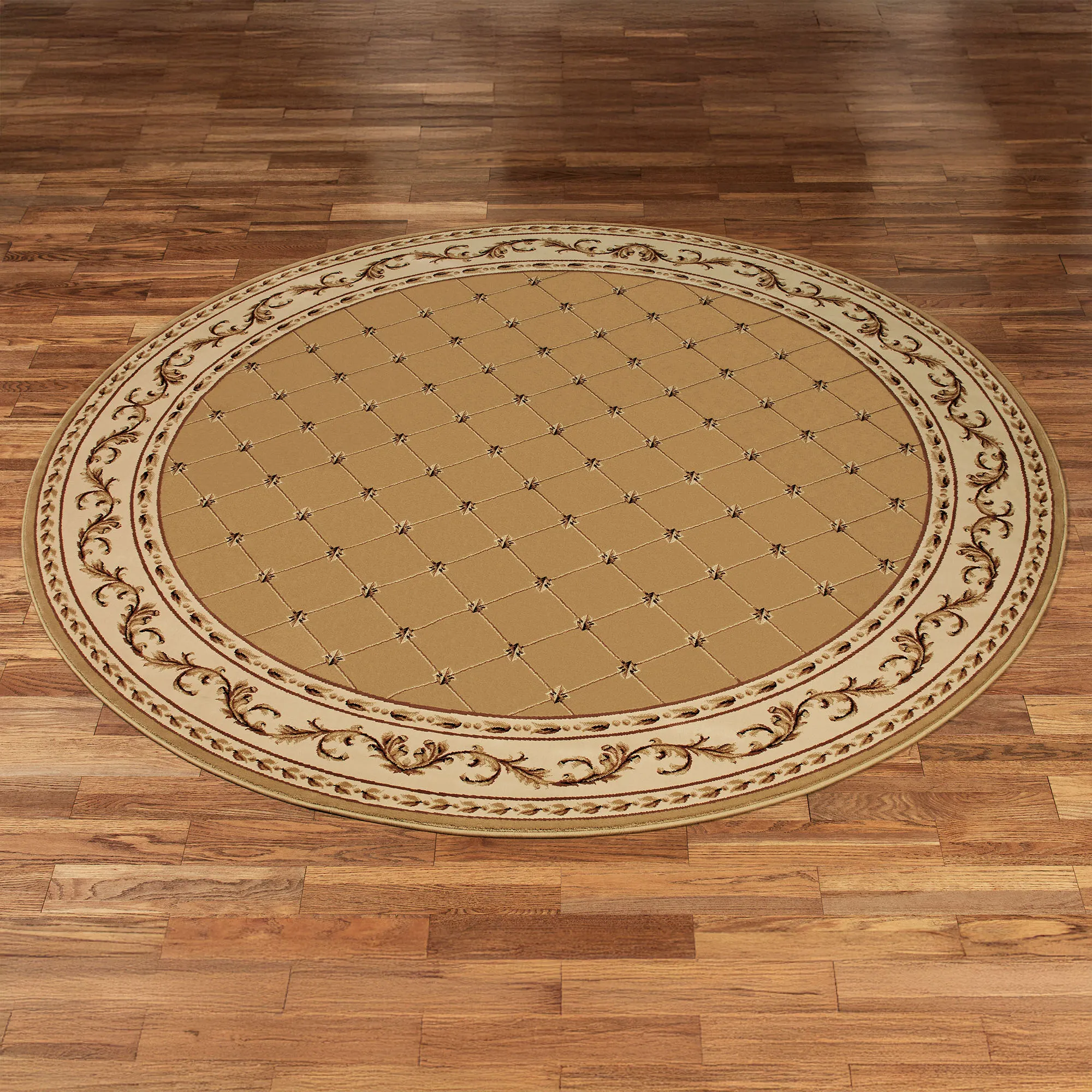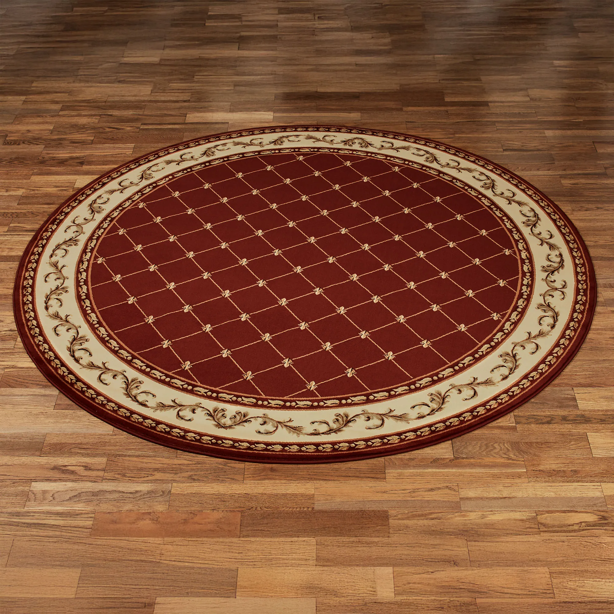 The Augusta Round Rug employs time-honored, traditional motifs to create an aesthetic of regal elegance. This machine-made polypropylene round rug, .32" thick, features a lattice pattern of fleurs-de-lis on a solid color background, surrounded by a border of leafy scrollwork. Accent colors include beige and gold. We recommend professional cleaning by a rug cleaner. Imported.