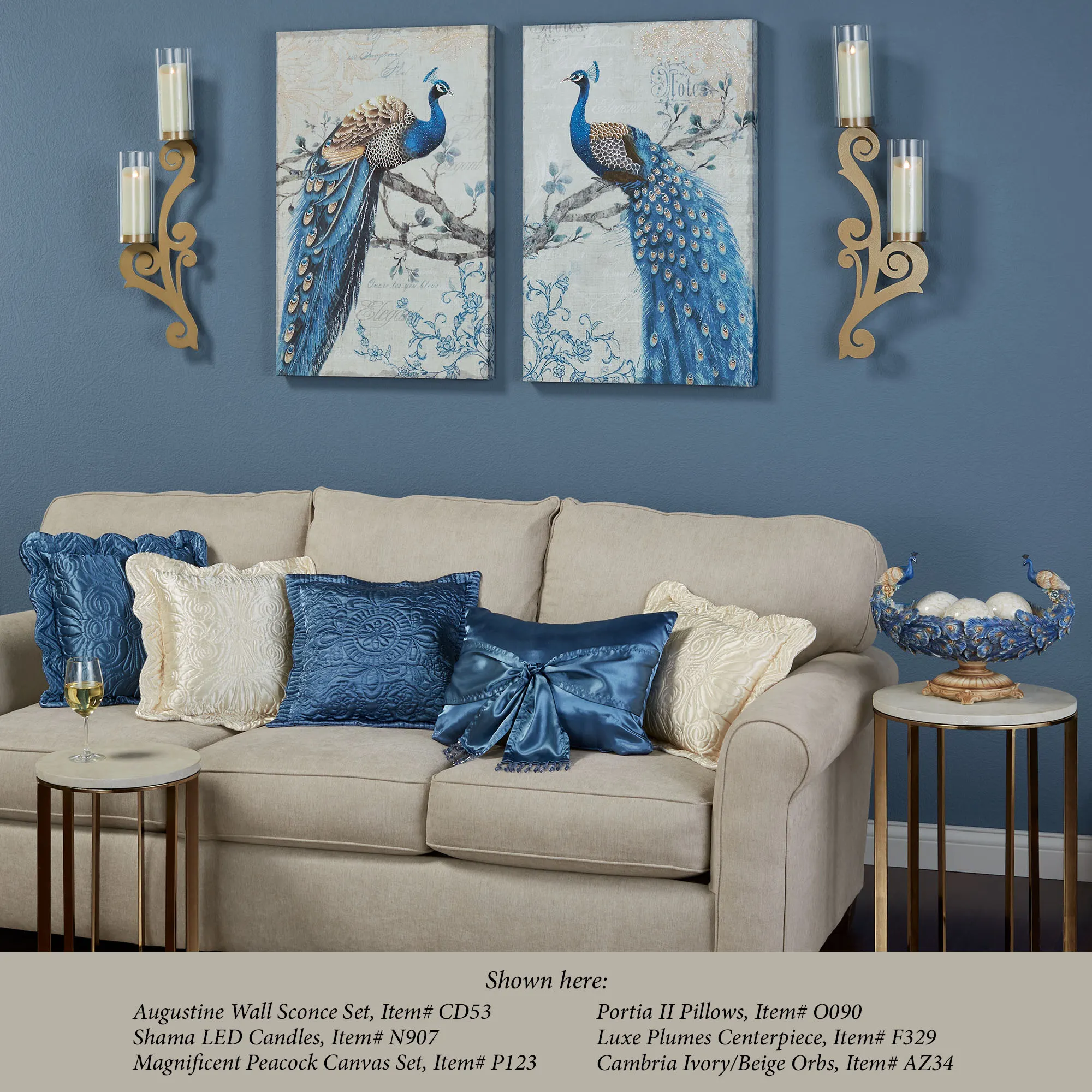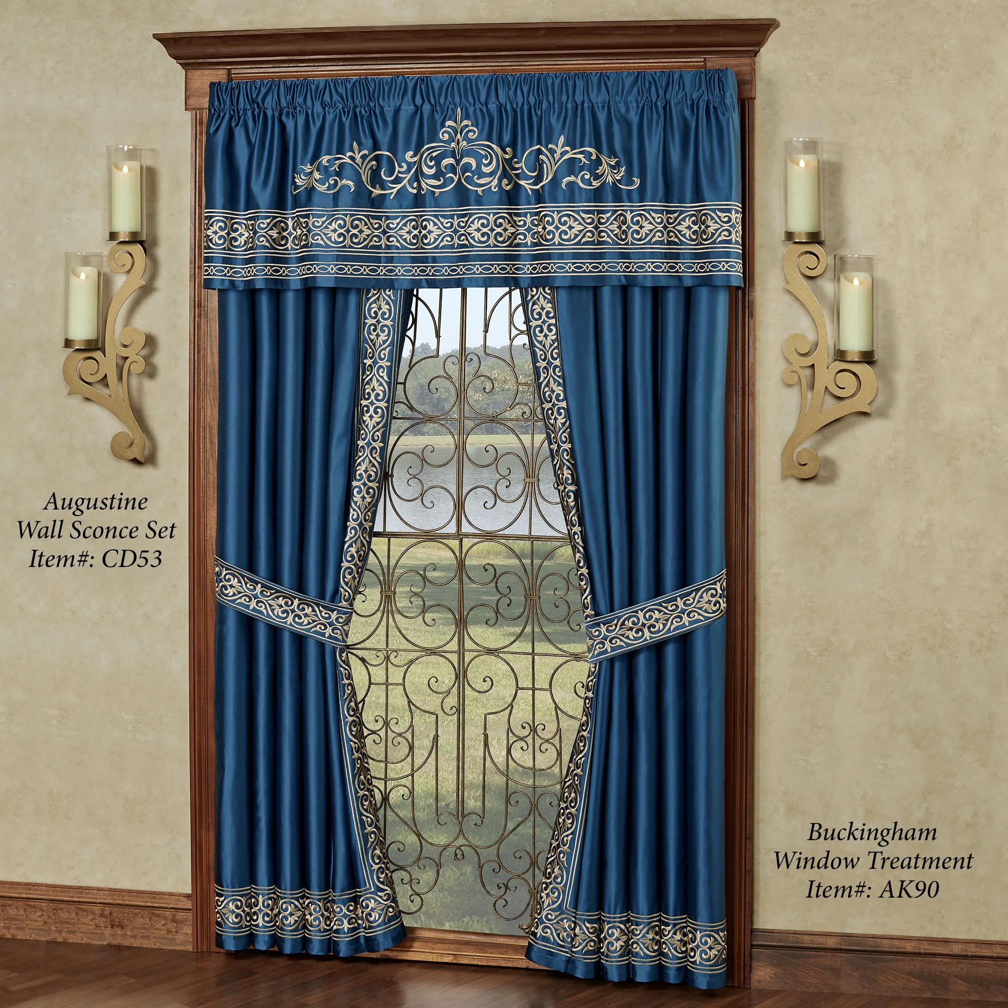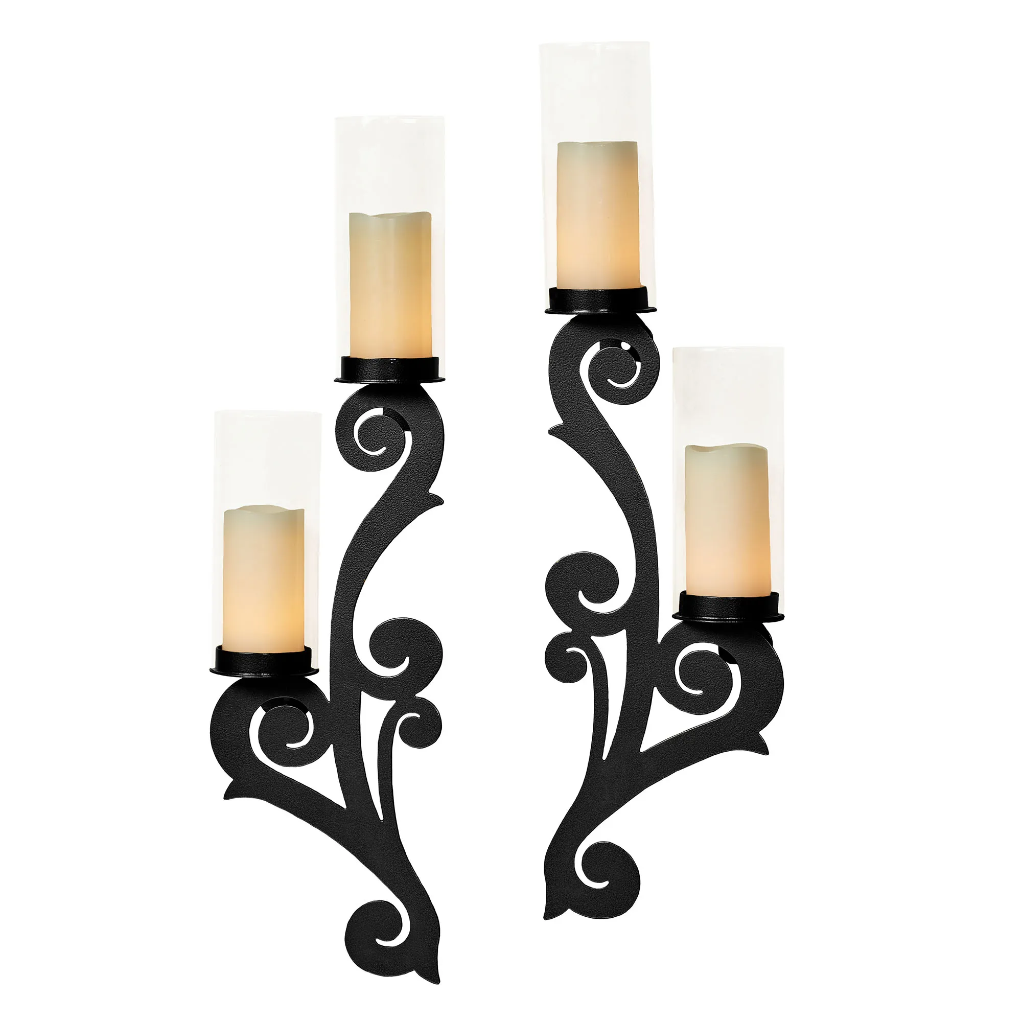 The Augustine Wall Sconce Set swirls with classic beauty. Handcrafted of 14-gauge steel, these wall sconces, designed by JasonW Studios(R), have a powder-coat finish that is UV-, weather-, and tarnish-resistant. Each sconce features scrolls and has two included clear glass hurricanes, 4"dia.x9.5"H each, that protect your 3" dia. candles from drafts. Each is 9"Wx5"Dx31.5"H.