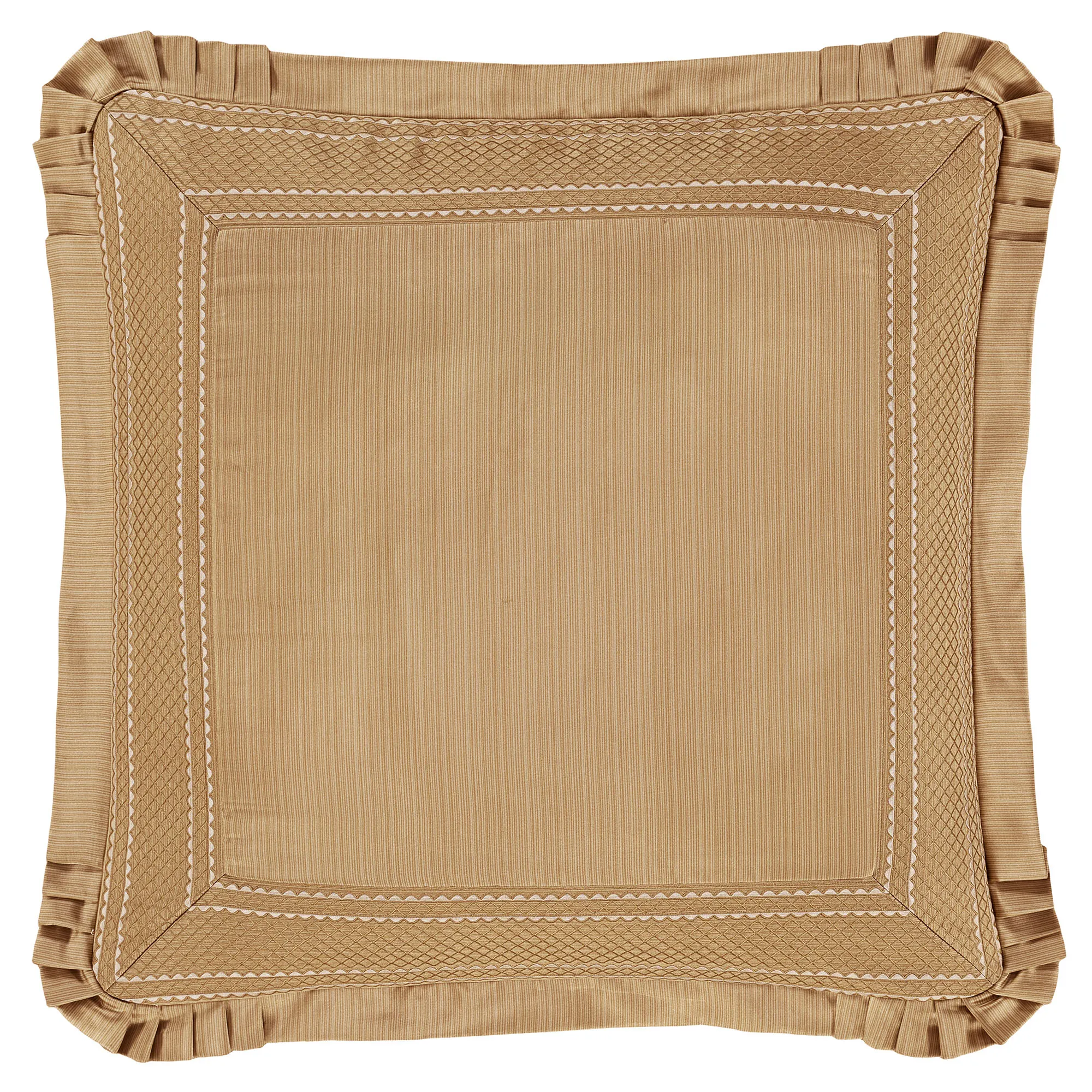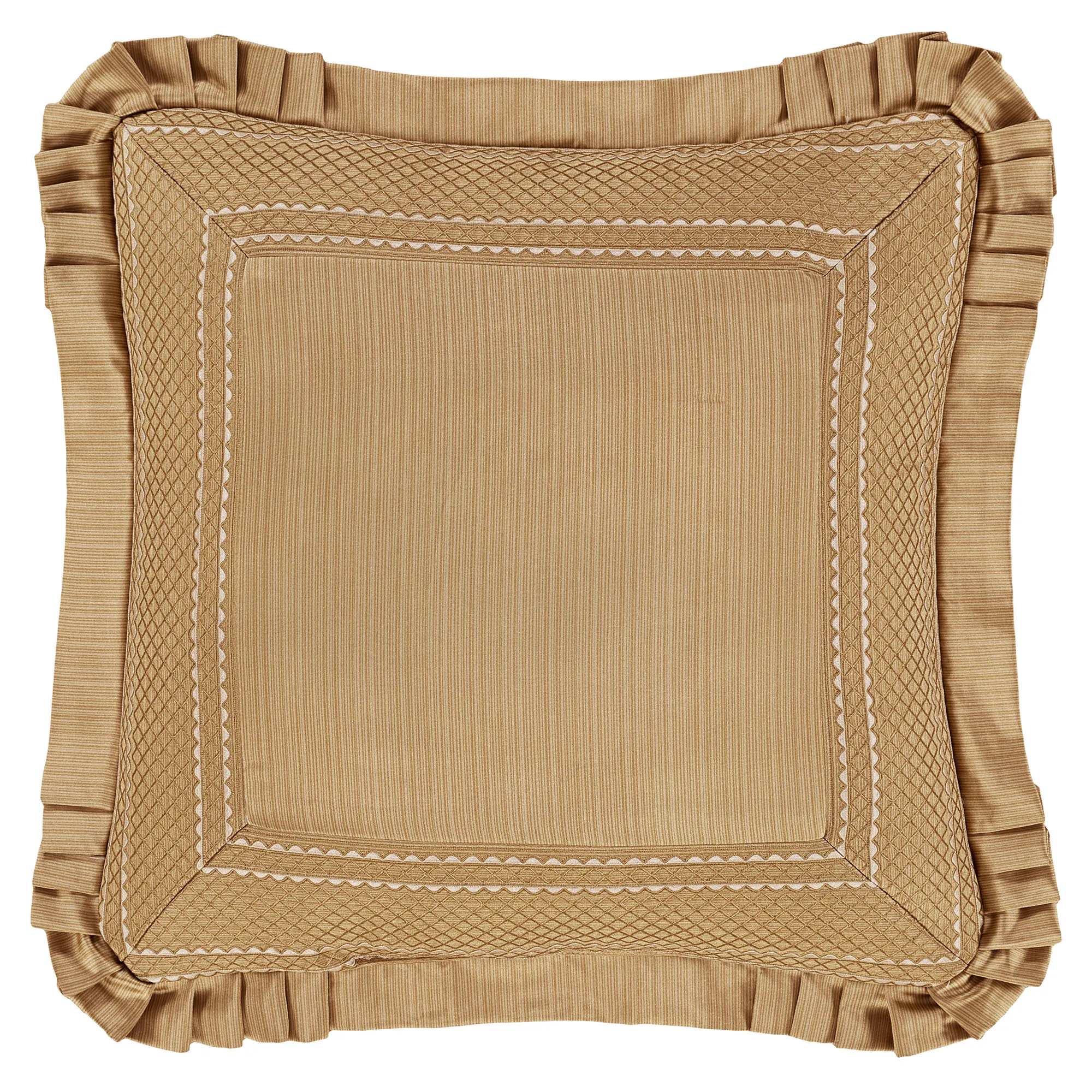 European Sham has striations pieced with a mitred diamond frame and flanged edges with pleated corners; reverses to striations; zipper closure.