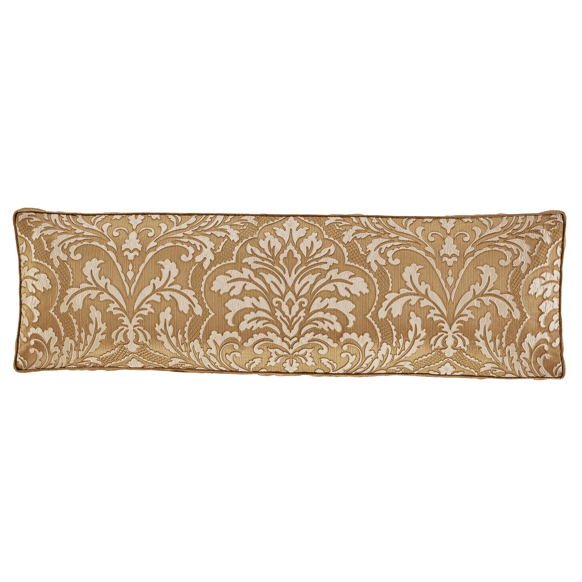 Golden tones envelop the Aurelia Bedding in a grand resplendent warmth. From J. Queen New York, the jacquard-woven ensemble features ivory leafy flourishing damask in a lavish overscale design on striated gold polyester satin. Golden elements embellished with striations and jacquard-woven diamonds further the innate elegance.