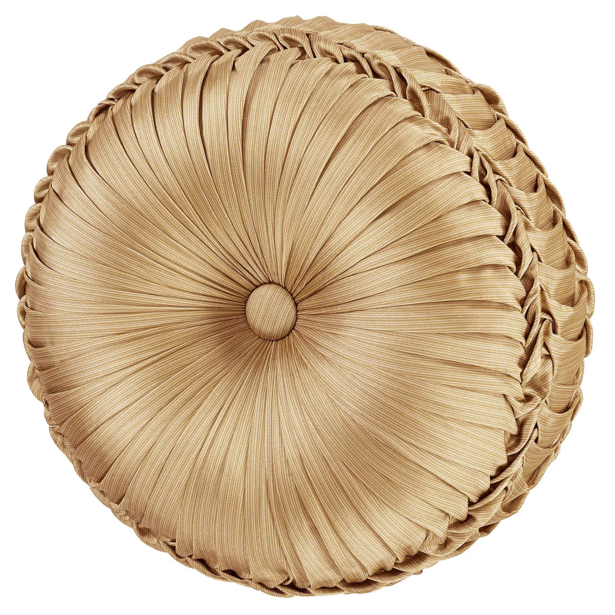 Pillows reverse to striations. Square has center striations pieced with a mitred diamond frame and flanged edges with pleated corners. The handcrafted Flanged Rectangle has ruched striations pieced with diamond bands and pleated flange ends. Jumbo Rectangle has damask, piped edges, and a 2.5" side gusset. Handmade Round has pleated striations, a button-tuft center, and a 3" side gusset.
