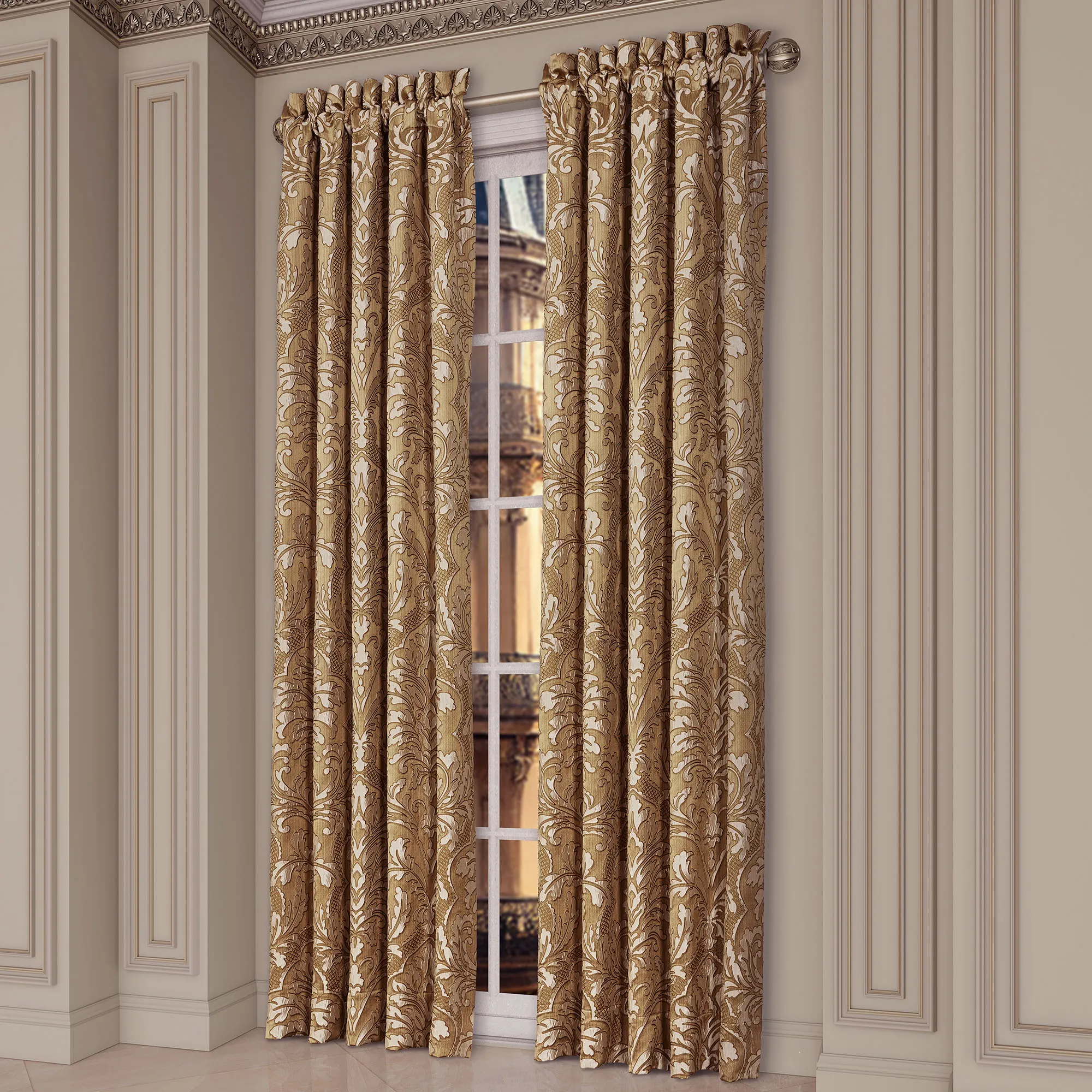 Lined Window Treatment has damask. Wide Curtain Pair has tailored edges and a 3" rod pocket. Tiebacks are included. Curtains are available in two lengths. Each Waterfall Valance has pleated flange and a 3.25" rod pocket. We recommend one valance for every 12"-15" of window width.
