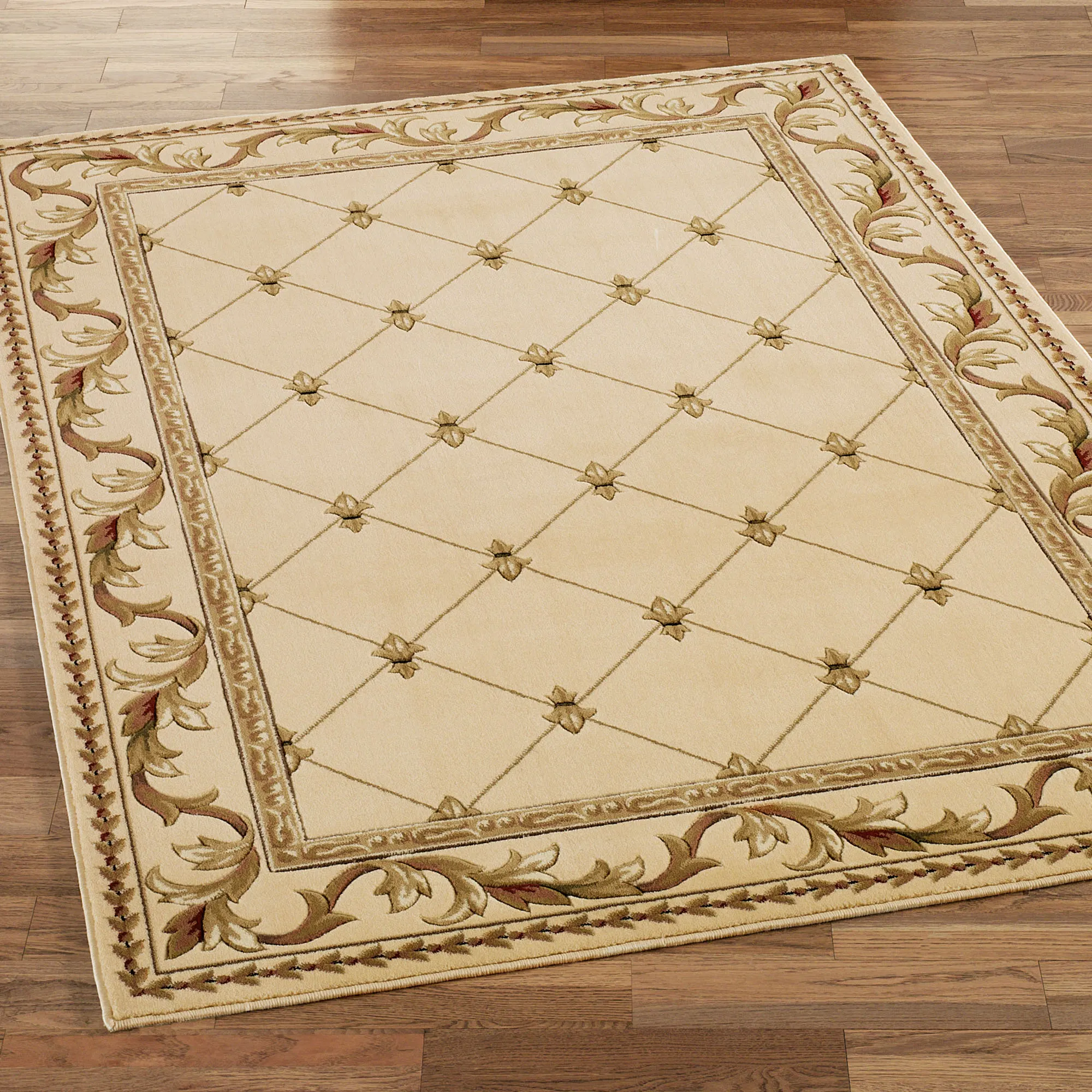 The Aurelius Area Rugs employ time-honored, traditional motifs to create an aesthetic of regal grace. Machine-made from polypropylene, these .5" thick, handcarved area rugs feature a lattice pattern of fleur-de-lis motifs, surrounded by a border of leafy scrollwork. Accent colors include ivory, black, wine red, and shades of gold. We recommend professional cleaning by a rug cleaner. Imported.