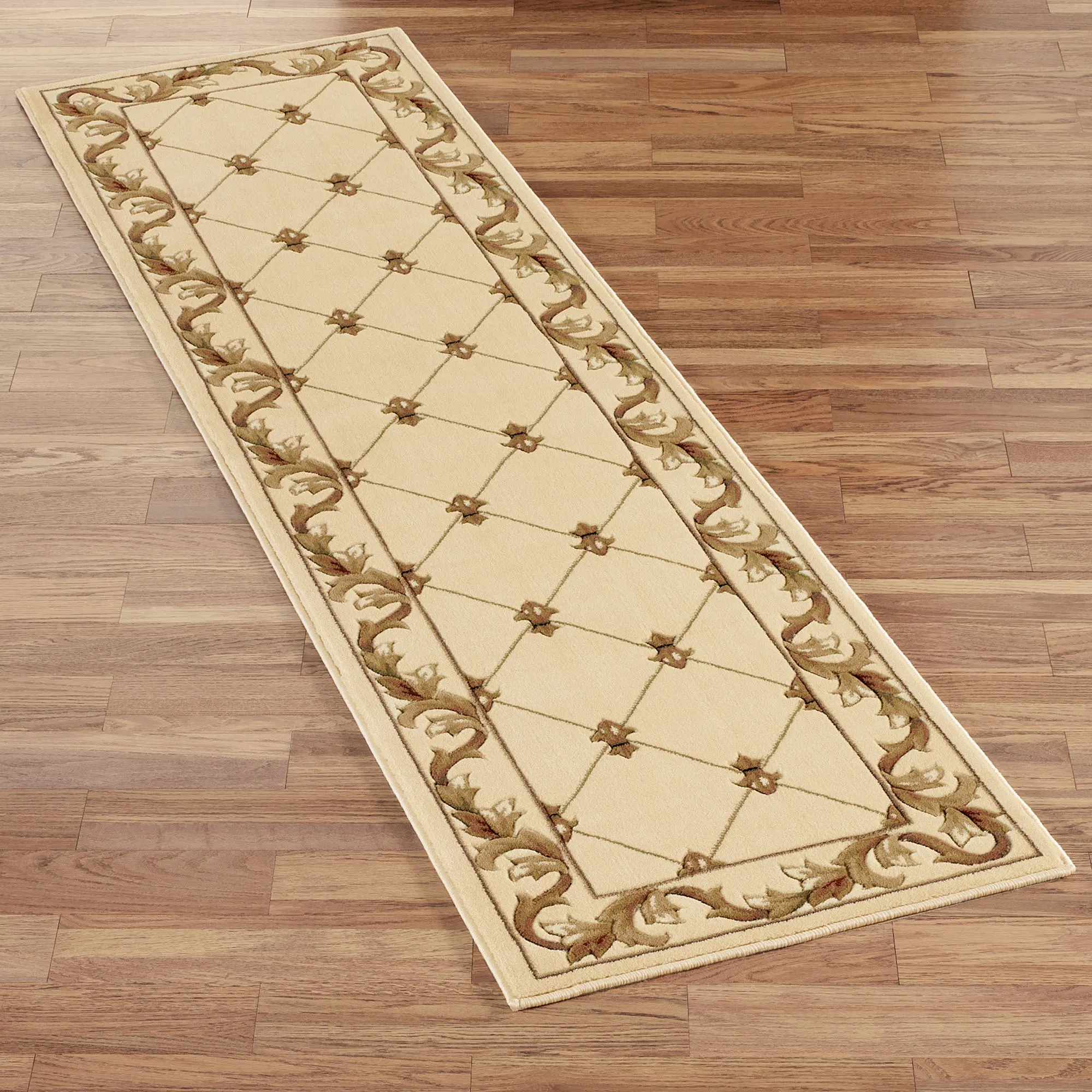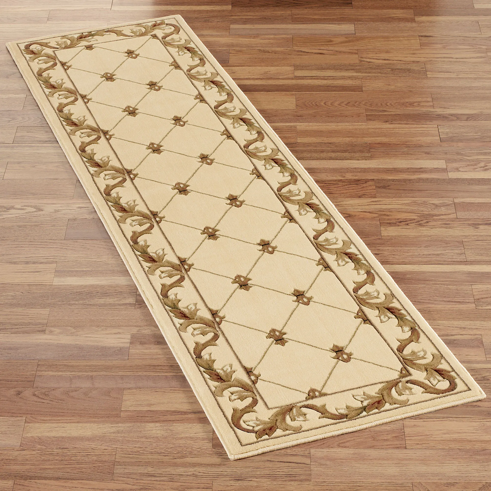 The Aurelius Rug Runner employs time-honored, traditional motifs to create an aesthetic of regal grace. Machine-made from polypropylene, this .5" thick, handcarved rug runner features a lattice pattern of fleur-de-lis motifs, surrounded by a border of leafy scrollwork. Accent colors include ivory, black, wine red, and shades of gold. We recommend professional cleaning by a rug cleaner. Imported.
