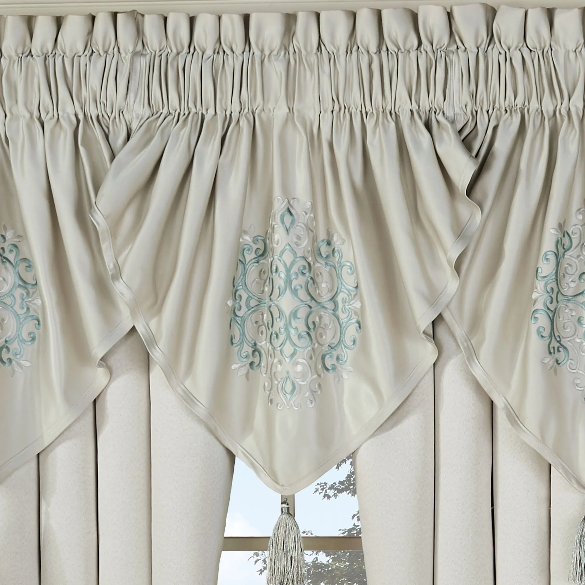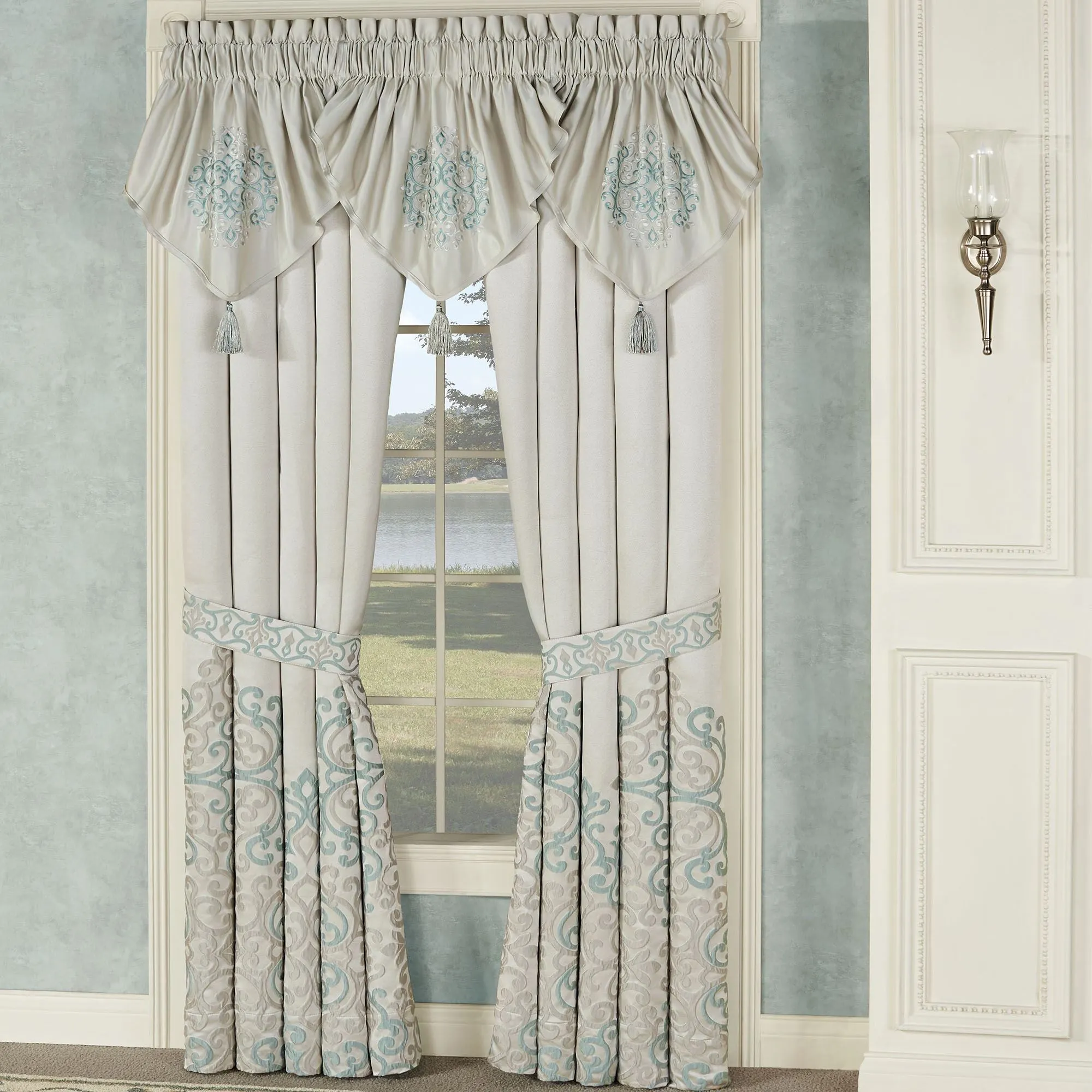 Enchanting scroll motifs flourish with radiant beauty on the Avalon Ascot Window Treatment. This luxurious polyester ensemble features scroll designs in silver-gray and spa on oyster. Lined window treatment has 3" rod pockets. Specify Ascot Valance or Wide Curtain Pair. Each Ascot Valance has embroidered scrolls and a 3.5"L tassel accent. The tailored Wide Curtains have jacquard-woven scrolls at the bottom and include tiebacks. Dry clean. Imported. The curtain pair width is the total width of two panels together.