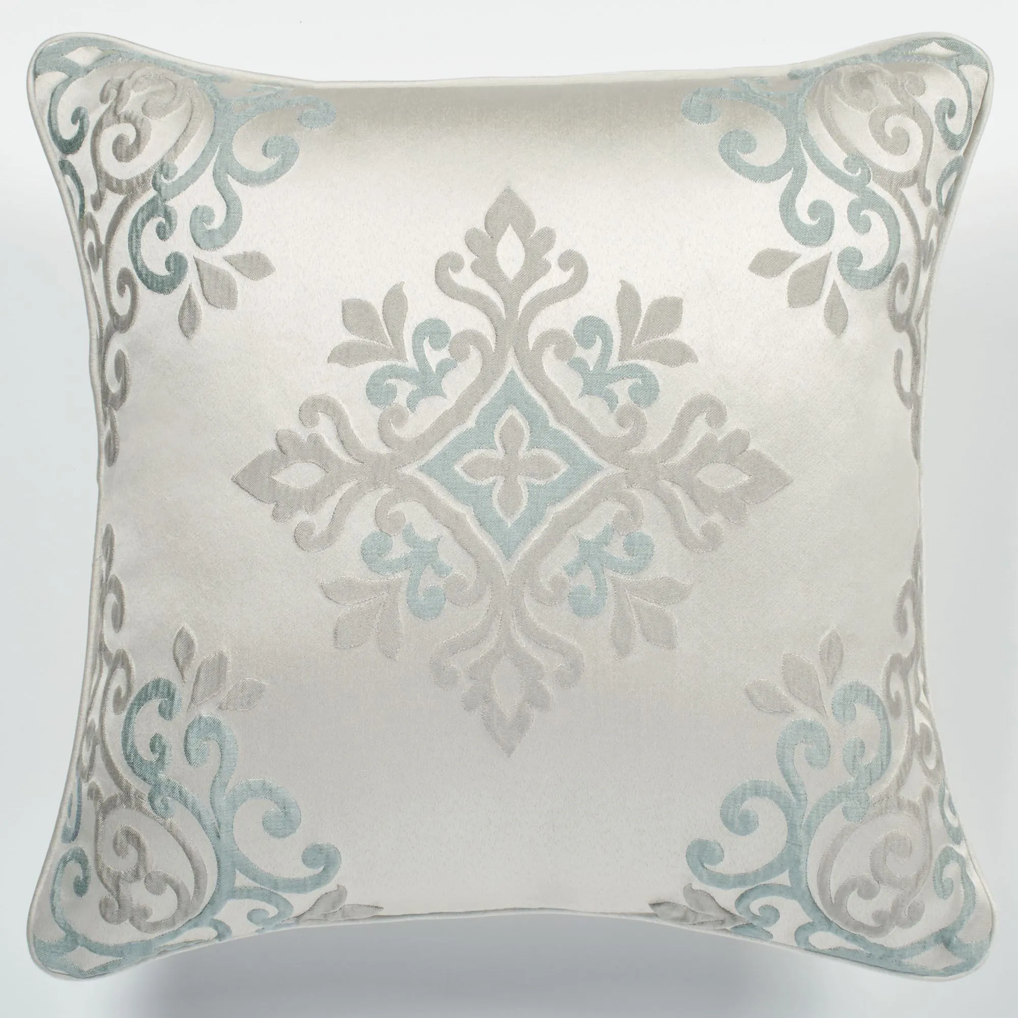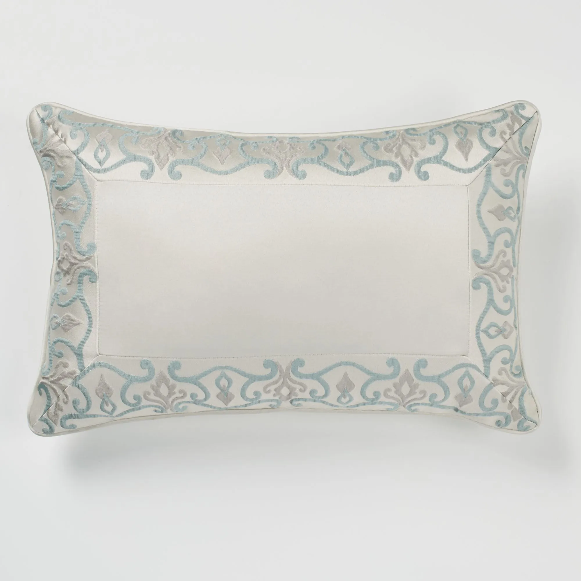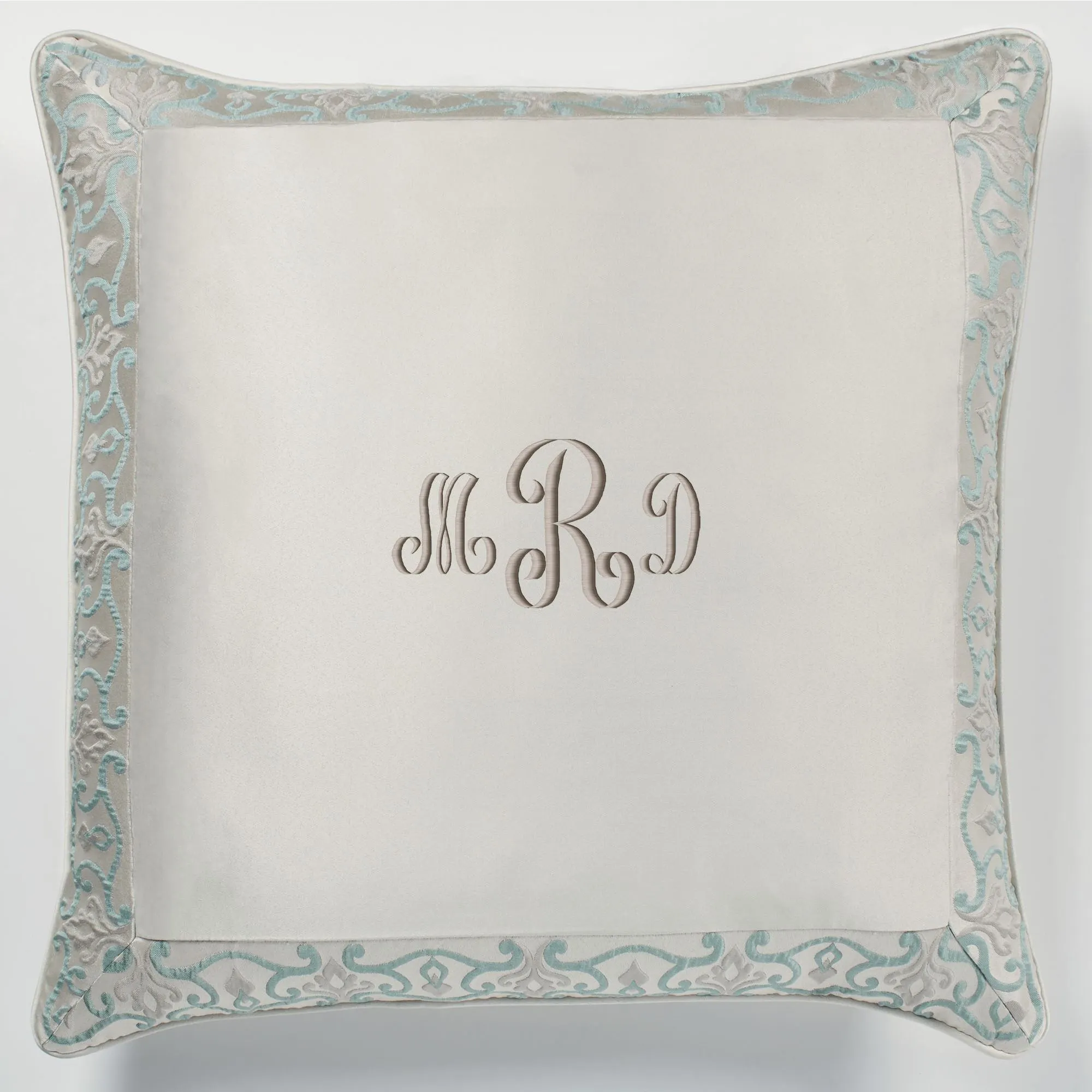 Piped Pillows: Spot clean. Rectangle has a solid oyster center with a pieced woven scroll border, mitred corners, and a zipper closure. Rectangle pillow may be monogrammed for an extra charge. Monogramming will be in the thread color shown. Round has embroidered scrolls on oyster and a 2" side gusset. Square has woven scrolls on oyster.