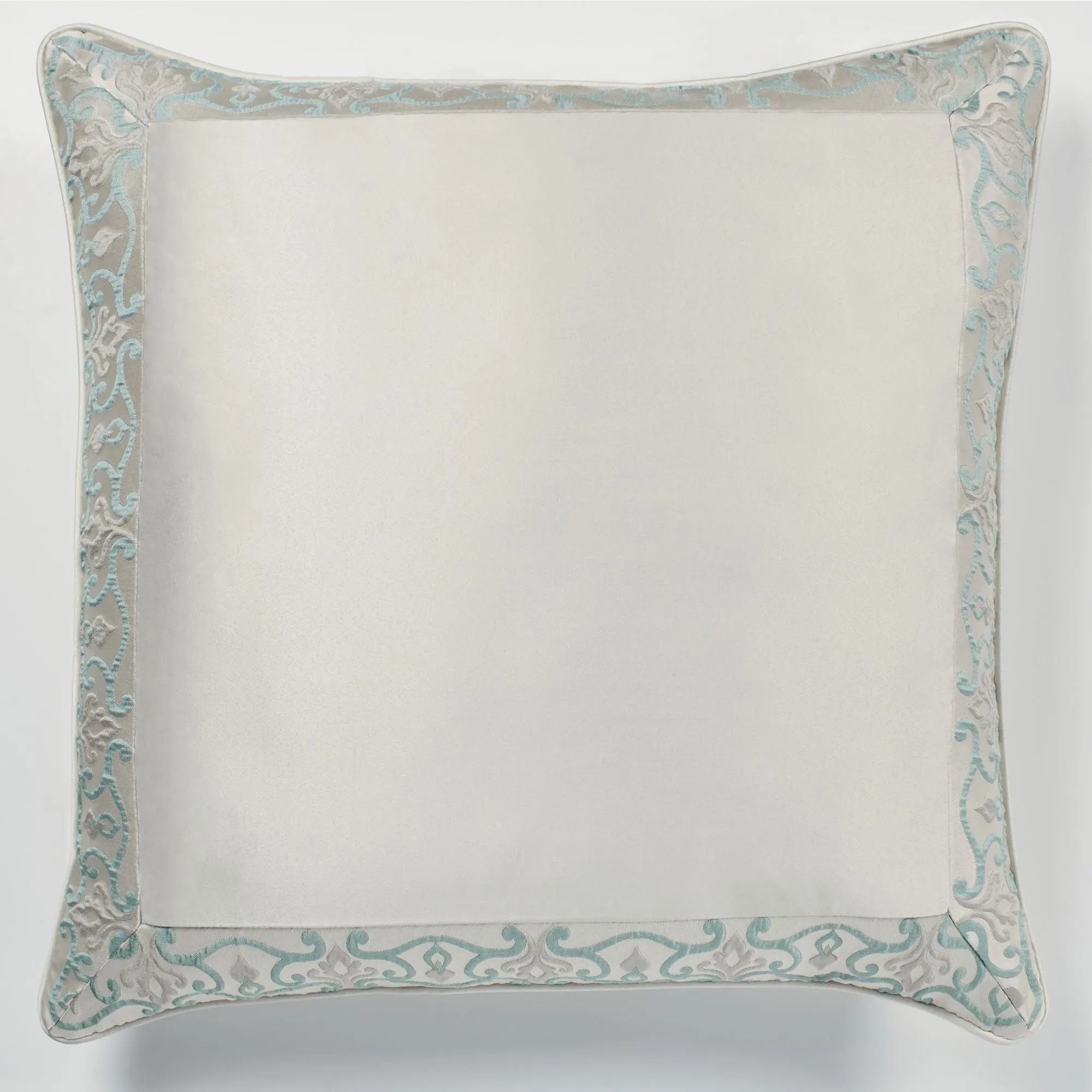 European Sham has a solid oyster center with a pieced woven scroll border, mitred corners, piped ends, and a zipper closure. European sham may be monogrammed for an extra charge. Monogramming will be in the thread color shown.