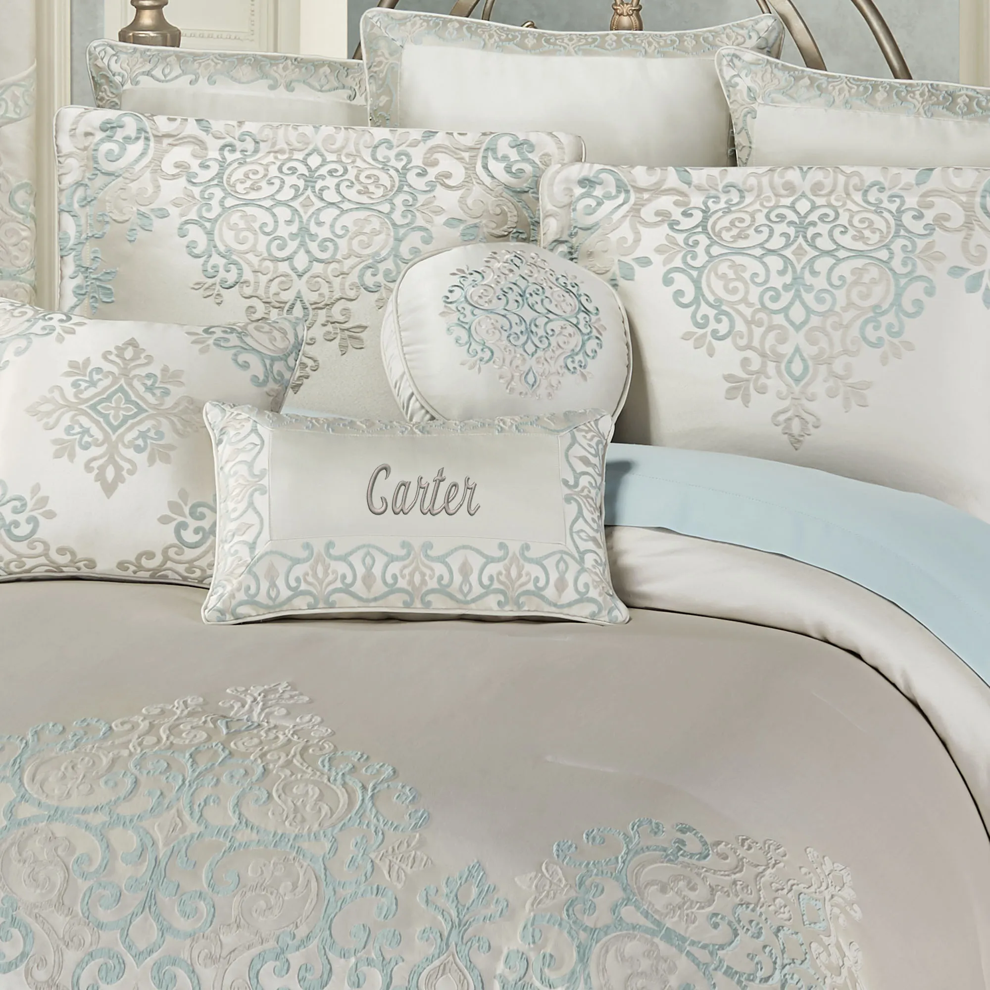 Enchanting scroll motifs flourish with radiant beauty on the Avalon Bedding. This luxurious polyester ensemble, an exclusive Touch of Class(R) design by J. Queen New York, features jacquard-woven designs. Colors include silver-gray, spa, and oyster.