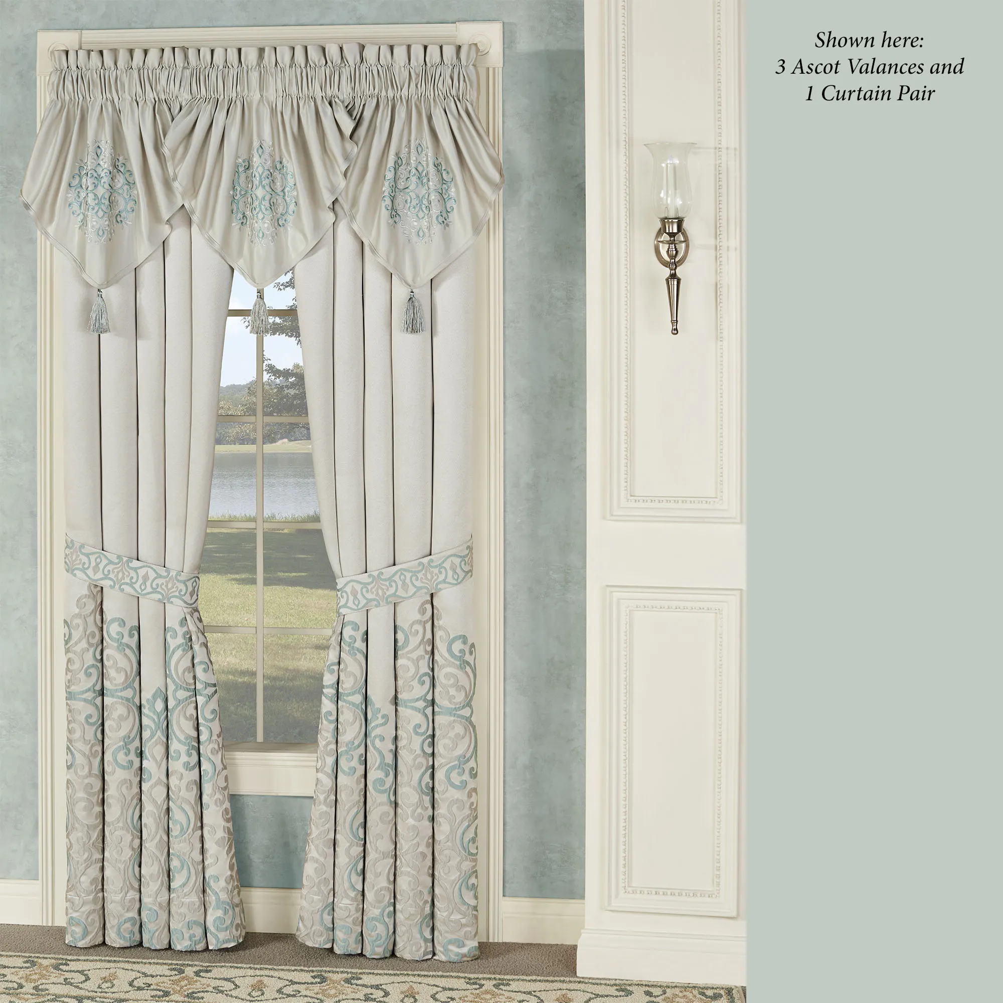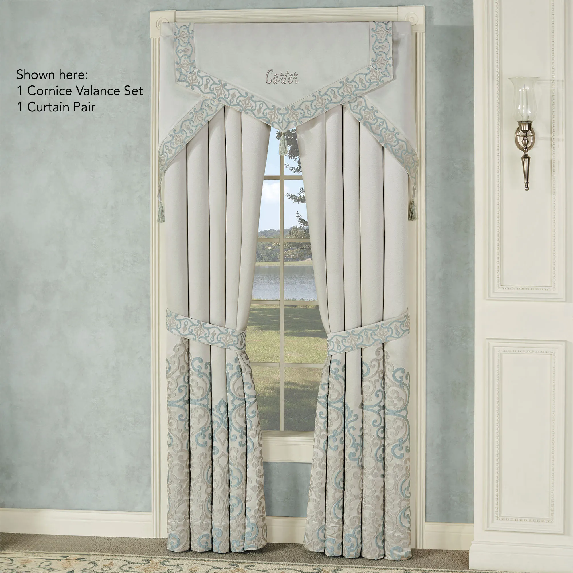 Lined Window Treatments have 3" rod pockets, except the Cornice Set. The tailored Wide Curtains have woven scrolls at the bottom and include tiebacks. Each Ascot Valance has embroidered scrolls on oyster and a 3.5"L tassel accent. The three-piece Cornice Set includes two sides and one center with 1.5" rod pockets. Valances have woven scrolls and 3.5"L tassel accents. Measurements do not include the tassels. Center piece of the cornice valance set may be monogrammed for an extra charge. Monogramming will be in the thread color shown. Tailored Valance has woven scrolls.