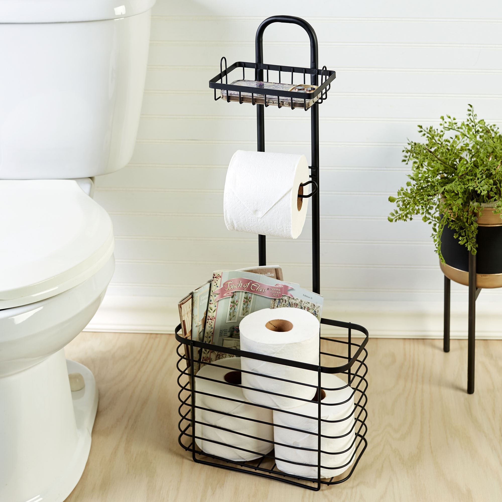 • Metal toilet paper reserve organizer