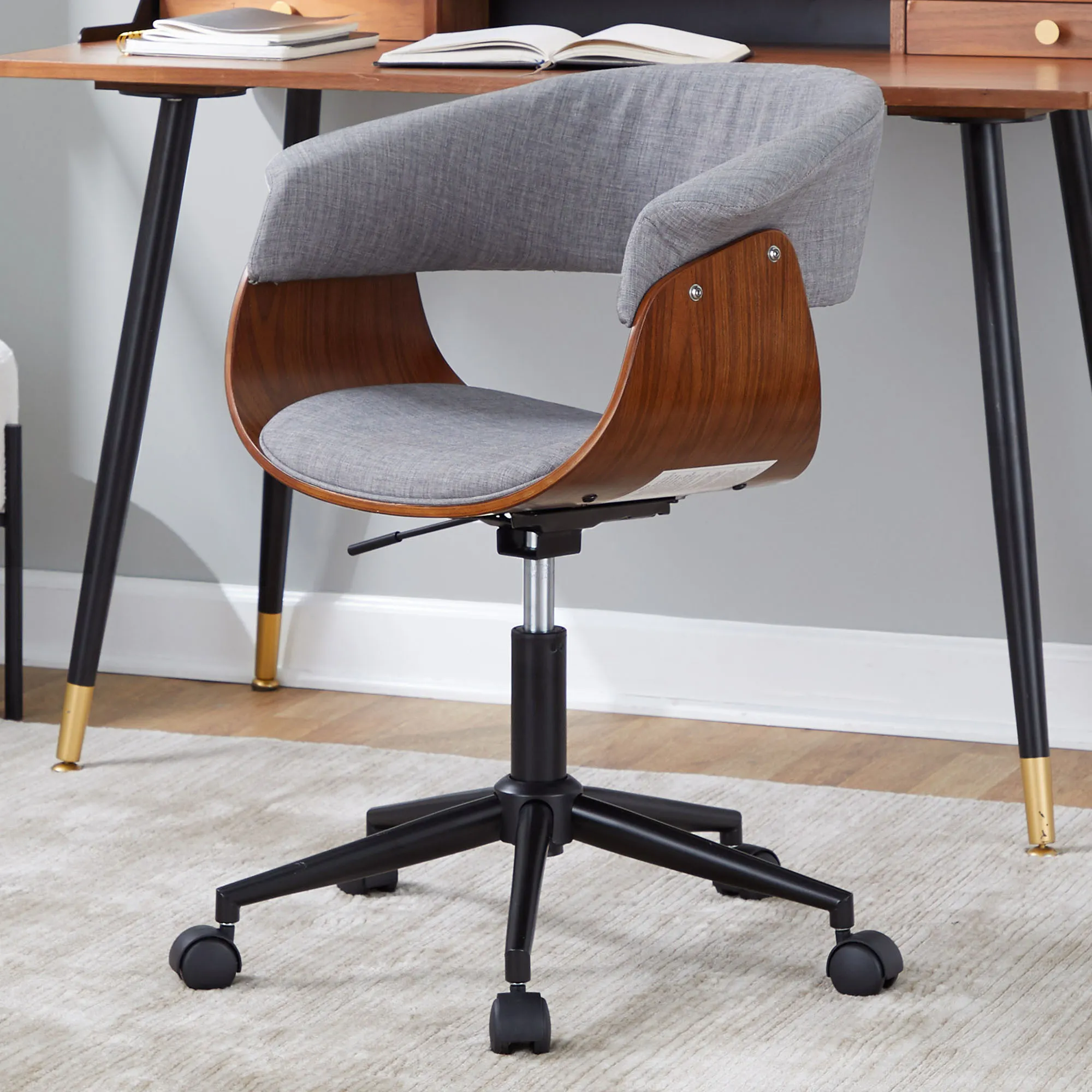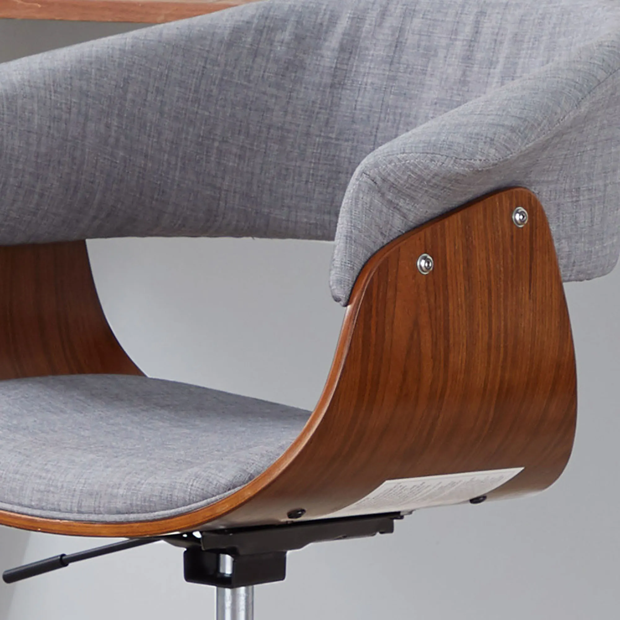 Sleek and very modish is a contemporary way to describe the Avery Modern Office Chair. This chair with its unique silhouette provides an open, airy look, while the flared armrests accent the durable, woven polyester gray upholstery. The curved side panels are solid walnut wood, and the black metal base has rolling casters. Simply use the side lever to adjust the height from 30"H to 33.75"H. The maximum recommended weight is 250 lbs. Chair is 24.5"Wx24"D; weighs 19 lbs. Spot clean the fabric.