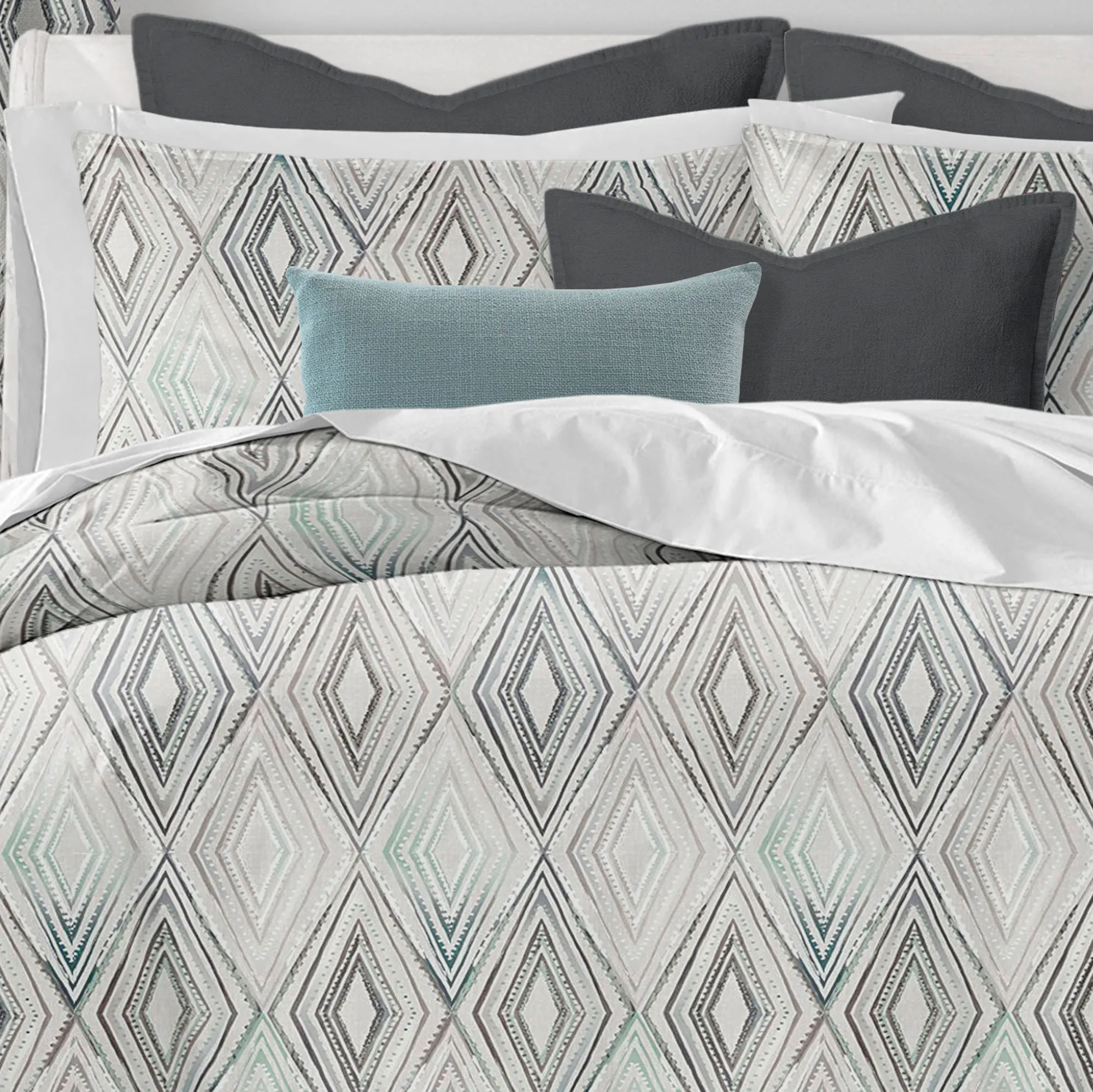 The Avianna Bedding graces a space with modern simplicity and geometrics. With a printed design, the contemporary cotton duck ensemble features a reverberated diamond motif in gray, charcoal, white, light green, teal, and platinum shades. Solid charcoal elements complete the design with a neutral accent.