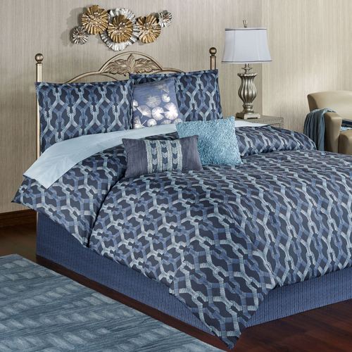 The Axel 7-Piece Comforter Bed Set by Dansk includes a comforter, bedskirt, 2 shams, and 3 decorative pillows. Comforter features printed entwined chain-link designs in various blue shades on dark blue polyester. Comforter reverses to blue wavy herringbone on dark blue polyester. Click on Details to read about the other items in the bed set. Fill is polyester. Machine washable; spot clean pillows. Imported.