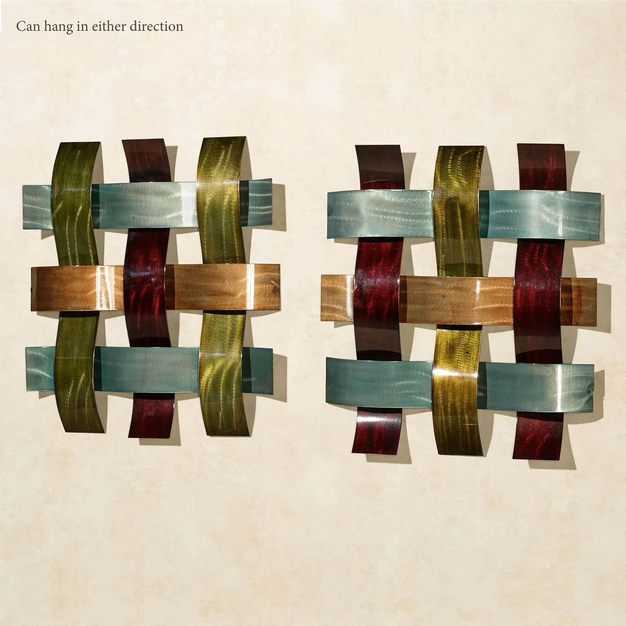 Hand-dyed metal ribbons weave their way across the Ayano Factory Second Woven Wall Art Set for truly contemporary decor. With the ability to hang in either direction, each metal artwork contains shades of light bronze, green, brown, and aqua. Due to the hand-finished nature of this item, variations will occur. Each measures 19"Wx1.5"Dx21"H. Please note: This wall art set is a factory second. Imperfections include cardboard grid line imprints in the finish on raised areas and rough textures in the paint.