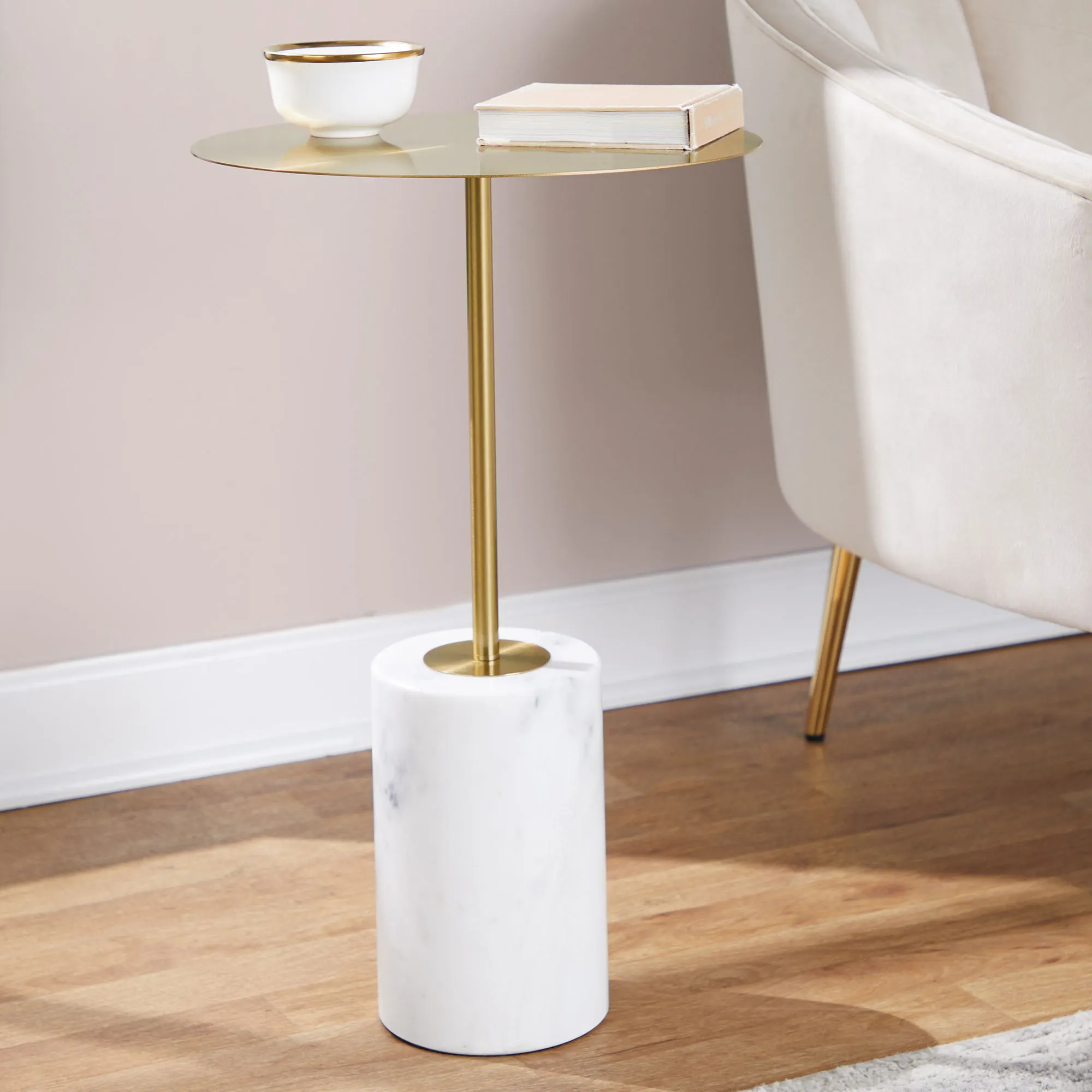 The Aziel Round Side Table is marble and metal.